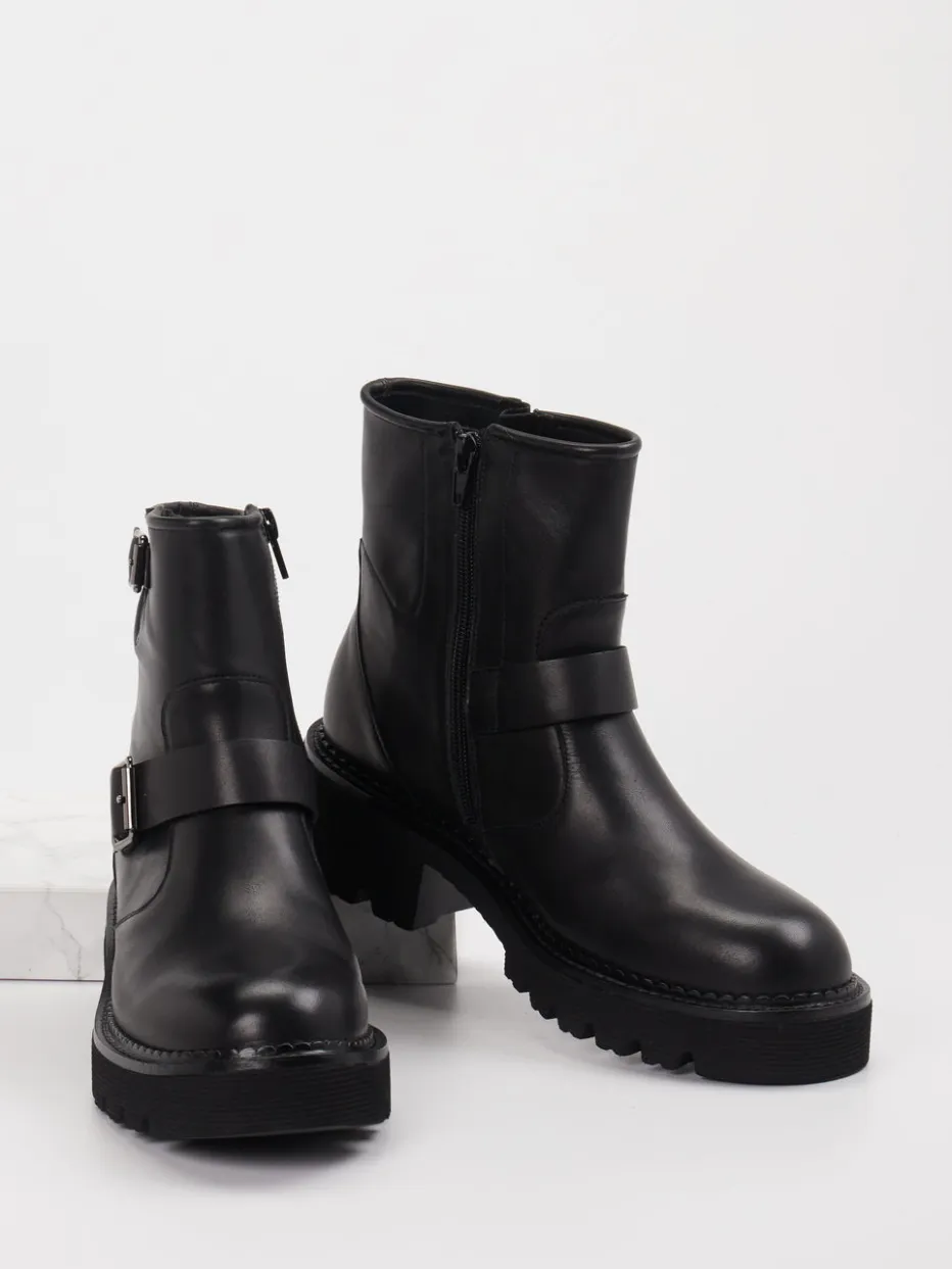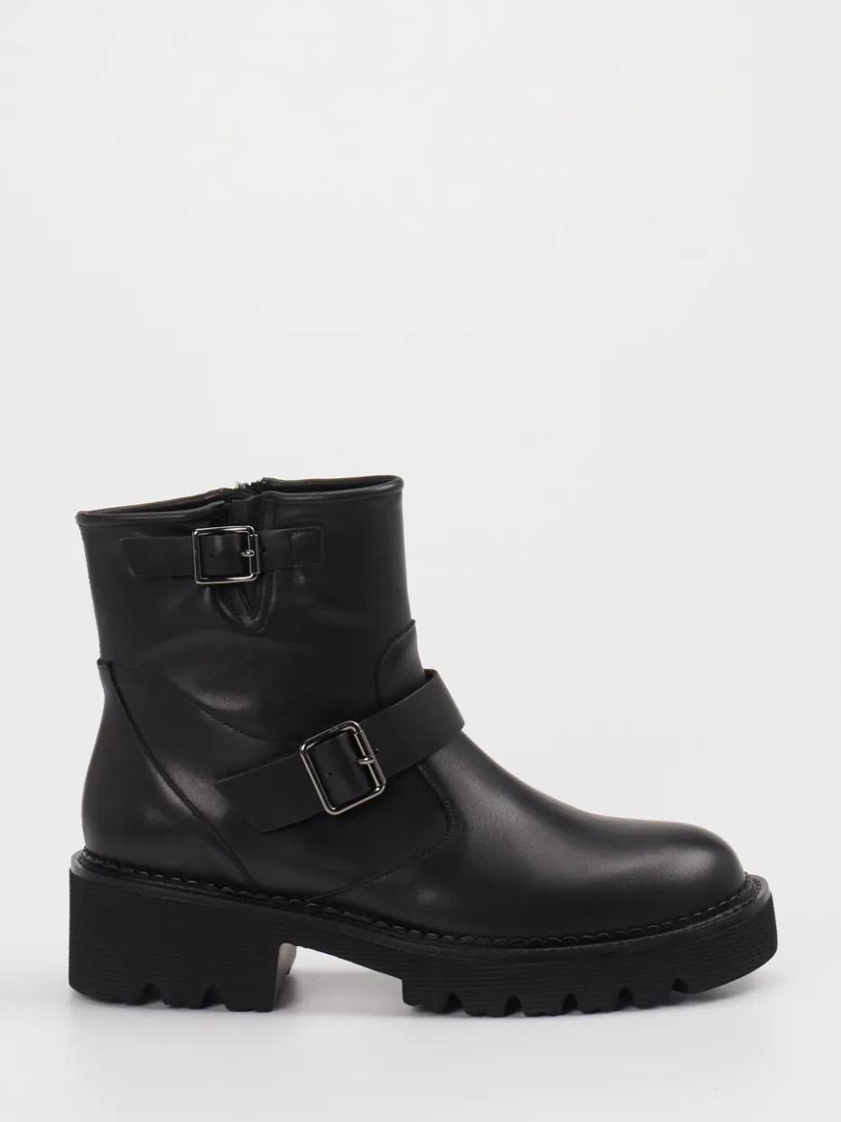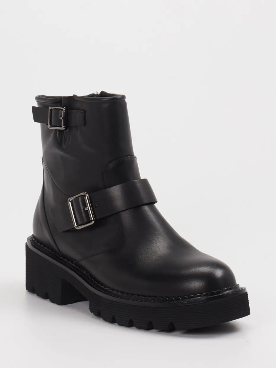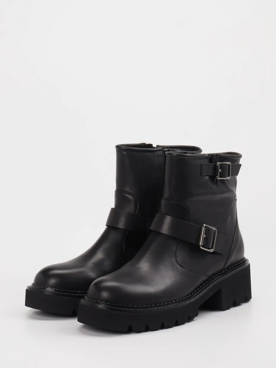 Die schwarze Biker-Stiefelette von Di Lauro verbindet robustes Leder mit markanten Schnallen und einer massiven Profilsohle – ein kraftvolles Statement für trendbewusste Streetwear-Looks.