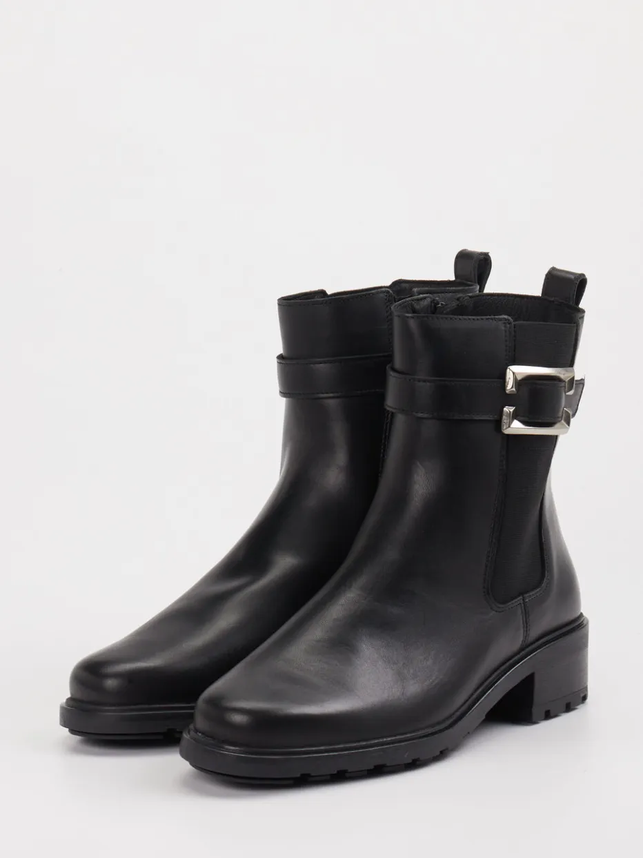 Komfort trifft auf urbanen Biker-Charme. Die Marke Solidus präsentiert mit dieser Damen-Stiefelette ein Modell aus der Biker-Kategorie, das Funktionalität und Design ausgewogen verbindet. Für den Alltag wie fürs Büro konzipiert, überzeugt die knöchelhohe Boots-Silhouette mit schwarzem Kalbleder und glänzender Oberfläche. Eine silberfarbene Schnalle, Ton-in-Ton-Nähte und ein seitlicher Elastikeinsatz geben der robust profilierten Gummisohle ein markantes Finish. Ein Reißverschluss erleichtert den Einstieg, während die breite Passform und das mikrofaserausgekleidete Innere hohen Tragekomfort bieten. Die chunky Sohle und utility-inspirierte Details greifen aktuelle Trends der AW24-Saison auf. Zeitloser Stil mit Komfortvorteil – für vielseitige City-Outfits von morgens bis abends.