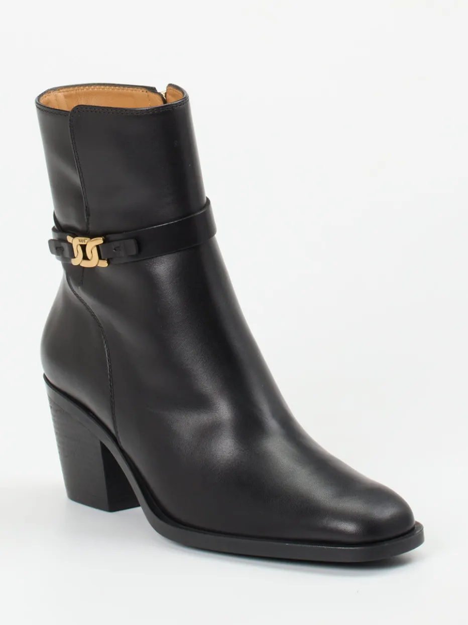 Eleganz für jeden Tag.Die Marke Tod’s bringt mit dieser klassisch-knöchelhohen Damen-Stiefelette ein stilvolles Modell für Business und Freizeit auf den Punkt. Die Stiefelette überzeugt durch ihr schwarzes Kalbleder mit glänzendem Finish und dezente Ton-in-Ton-Nähte. Ein seitlicher Reißverschluss erleichtert den Einstieg, während die dekorative Riemenschnalle mit goldfarbener Markenprägung einen subtilen Akzent setzt. Die 6 cm hohe Blockabsatzform wirkt feminin und sorgt zugleich für Stabilität. Ihre klare Silhouette und souveräne Materialanmutung machen sie zu einem stilsicheren Begleiter moderner „Quiet Luxury“-Looks. Tod’s steht für meisterhafte Verarbeitung und einen zurückhaltend-luxuriösen Auftritt.