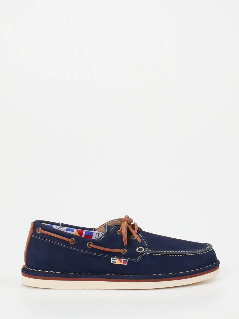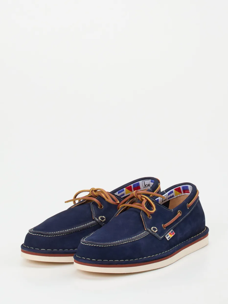 Sommerklassiker mit Stilpotenzial.Joe interpretiert den traditionellen Bootsschuh neu. Für entspannte Stunden am Wasser oder stilvolle Freizeit-Looks bietet dieser Bootsschuh aus blauem Nubukleder die perfekte Grundlage. Die samtig angeschliffene Oberfläche überzeugt durch hochwertige Haptik, während cognacfarbene Details, weiße Kontrastnähte und ein Flaggenprint-Innenfutter für visuelle Akzente sorgen. Das umlaufende Lederband und die Schnürung mit Metallösen unterstreichen den maritimen Charakter. Flexible Gummisohle und gepolstertes Kalblederfußbett sorgen zudem für hohen Tragekomfort. Ideal kombinierbar mit Leinenhemd und Chino. Ein modernes Update des Segelstils mit portugiesischer Wertarbeit.