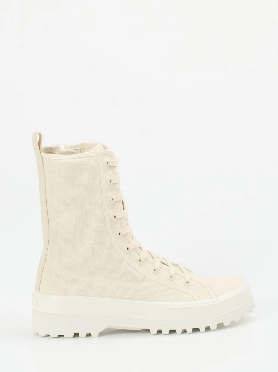 Stilvolle Funktion für urbane Abenteuer.Die Marke Superga zeigt mit diesen Canvas-Boots eine moderne Freizeitinterpretation der klassischen Utility-Stiefelette. Ideal für wechselhafte City-Tage bieten die hochschaftigen Stiefel aus hellbeigefarbenem, strukturiertem Textilmaterial minimalistisches Design mit funktionalem Mehrwert. Die matt gehaltene Oberfläche unterstreicht die monochrome Erscheinung. Eine grob profilierte Gummisohle sorgt für festen Halt auf verschiedenen Untergründen, während der seitliche Reißverschluss den Einstieg erleichtert. Dezente Markenprägungen und die schmal zulaufende Silhouette runden den lässigen Look ab. Kombiniert mit Parka und Rucksack entsteht ein vielseitiger Streetstyle. Superga steht hier für klare Formensprache, Tragbarkeit und modern interpretierten Outdoor-Charme.