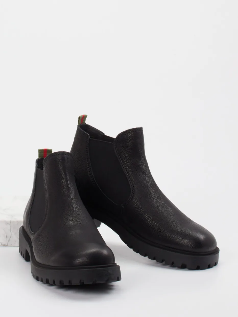 Design trifft Funktionalität.Think präsentiert eine komfortorientierte Stiefelette für Alltag und Freizeit. Ob beim Spaziergang durch die Stadt oder auf herbstlichem Terrain – dieser Chelsea Boot erfüllt stilvolle Ansprüche. Gefertigt aus schwarzem Kalbleder mit genarbter Oberfläche, verbindet er hochwertige Haptik mit zurückhaltender Optik. Elastikeinsätze ermöglichen einfaches Anziehen, während die markante Gummisohle sicheren Tritt bietet. Der grün-rot gestreifte Zugriemen am Schaft setzt dezent urbane Akzente im Sinne des Quiet-Utility-Trends. Perfekt kombinierbar mit Cargohosen oder Strickkleid für einen lässigen Streetwear-Look. Ein durchdachtes Modell mit ergonomischem Anspruch – typisch Think.