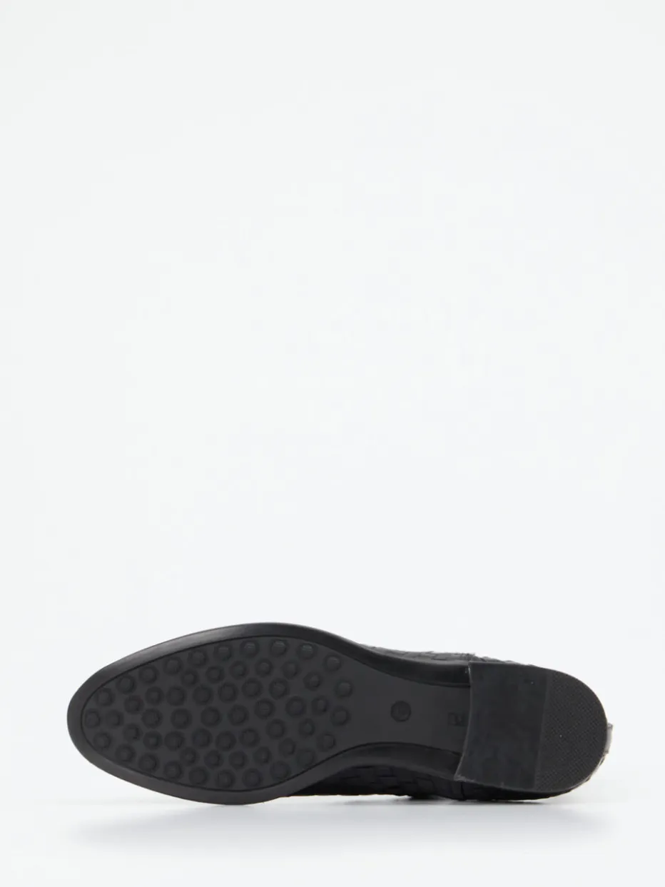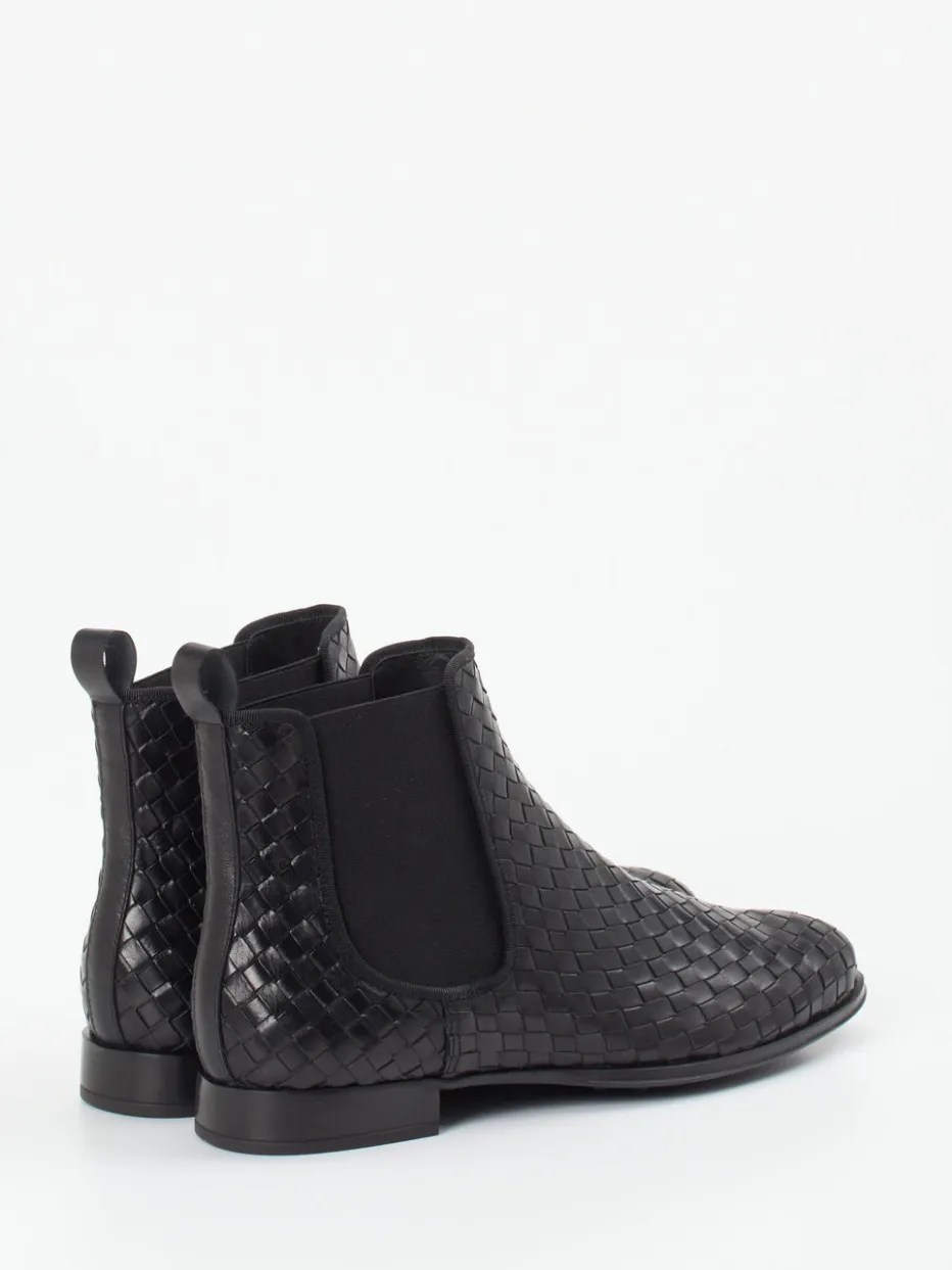 Diese schwarzen Chelsea Boots aus hochwertigem Kalbleder überzeugen durch eine edle Flechtstruktur und ein minimalistisches Design – perfekt für einen stilvollen Everyday-Look.