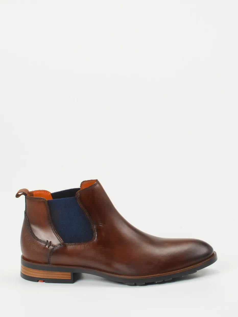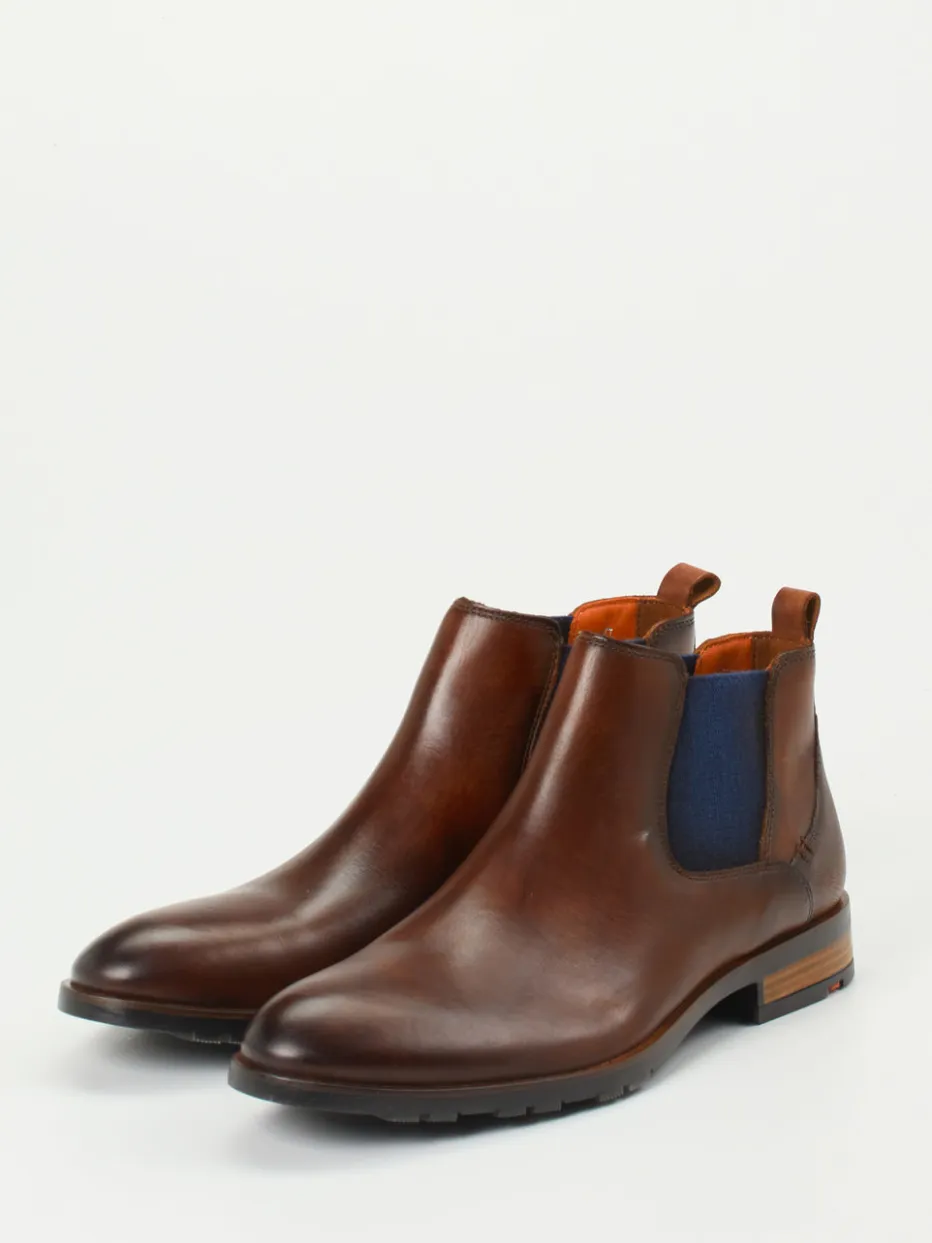 Stilklassiker mit modernem Akzent.Lloyd interpretiert die Herren-Stiefelette im Chelsea-Stil mit klarer Formensprache und glänzendem Kalbleder neu. Ob im Büro oder am Wochenende – das mittelbraune Obermaterial aus hochwertigem Kalbleder mit samtigem Glanz bringt Eleganz und Langlebigkeit in den Alltag. Die dunkelblauen Elastik-Einsätze und das kontrastfarbene Innenfutter in Orange setzen stilvolle Akzente. Eine strukturierte Ferse, die klassische Schlupfform und eine rutschfeste Gummisohle bieten Komfort und Stabilität. Minimalistische Details treffen auf Heritage-inspirierte Ästhetik und passen ideal zum Smart-Casual-Trend. Ein vielseitiger Allrounder mit markentypischer Handwerkskunst und Understatement.