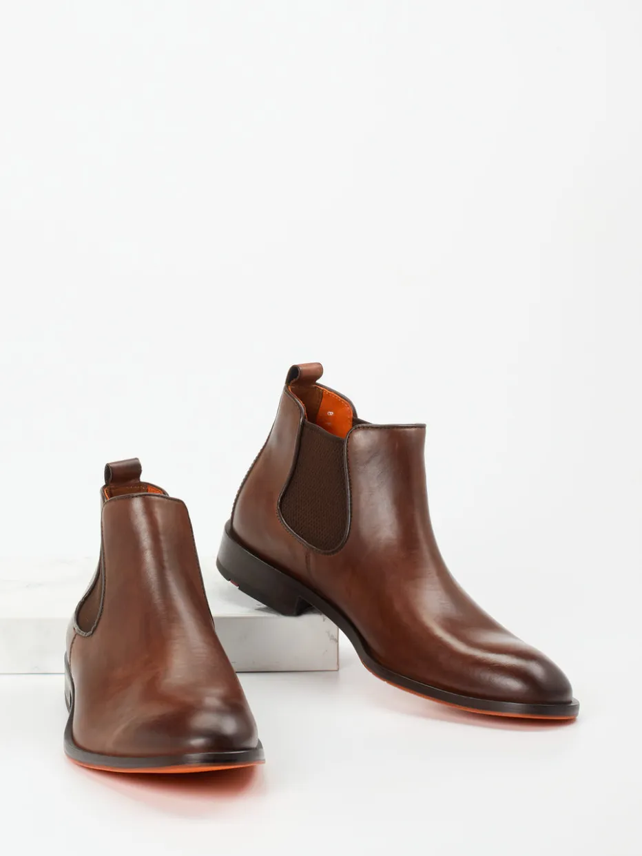 Perfekt für berufliche Anlässe oder urbane Freizeitmomente: Das matt strukturierte, mittelbraune Kalbleder verleiht dem schlanken Schaft eine edle Zurückhaltung. Klassische Elastikeinsätze an den Seiten und eine dezente Anziehschlaufe sorgen für komfortables An- und Ausziehen. Im Kontrast dazu steht die auffällig gestaltete, rutschfeste Laufsohle mit orangerotem Farbton und stilisierter Prägung – ein markanter Akzent im Trendsegment „Quiet Luxury“. Die klassische Passform lässt sich vielseitig zu Tailoring oder Denim kombinieren.