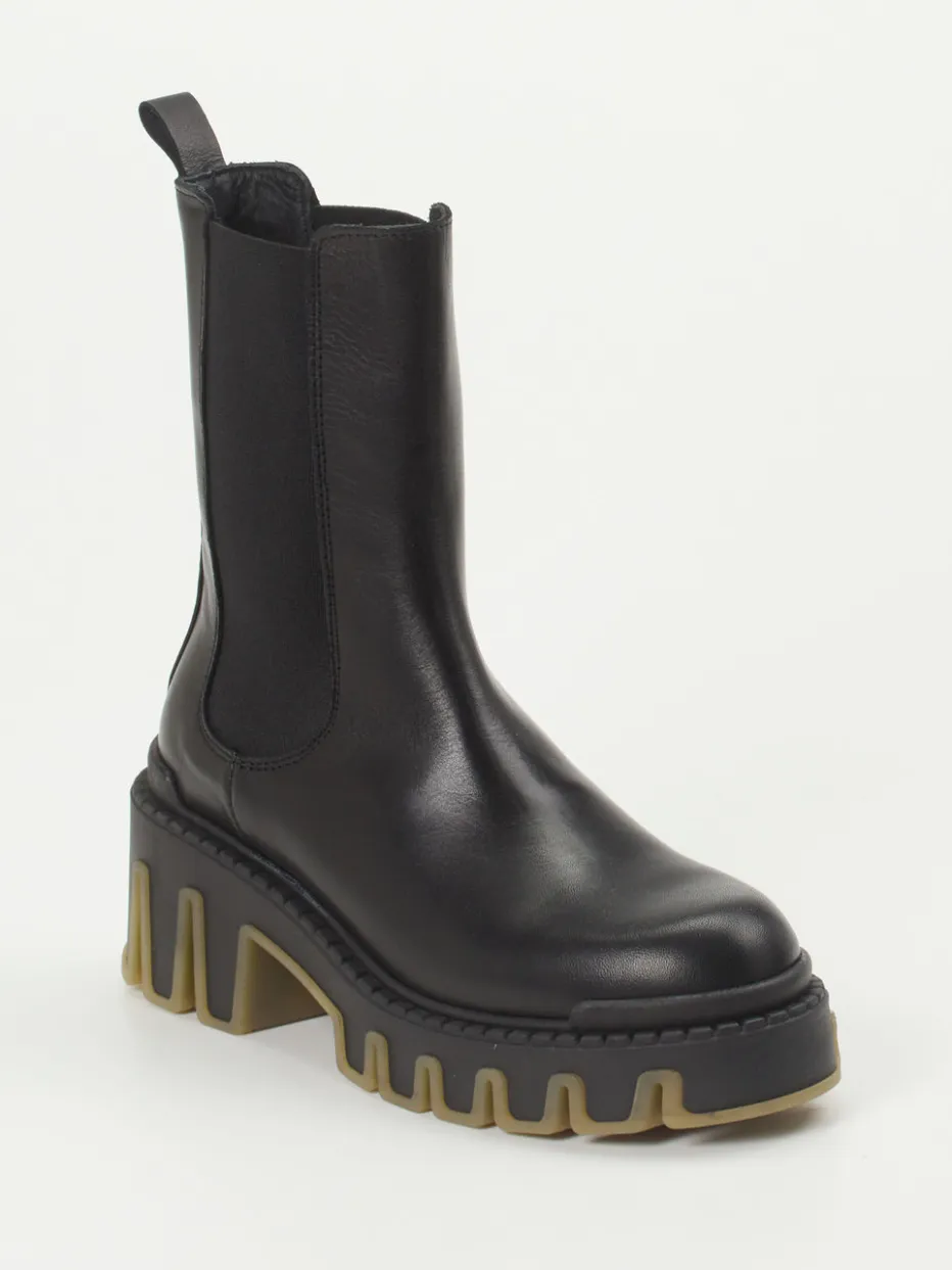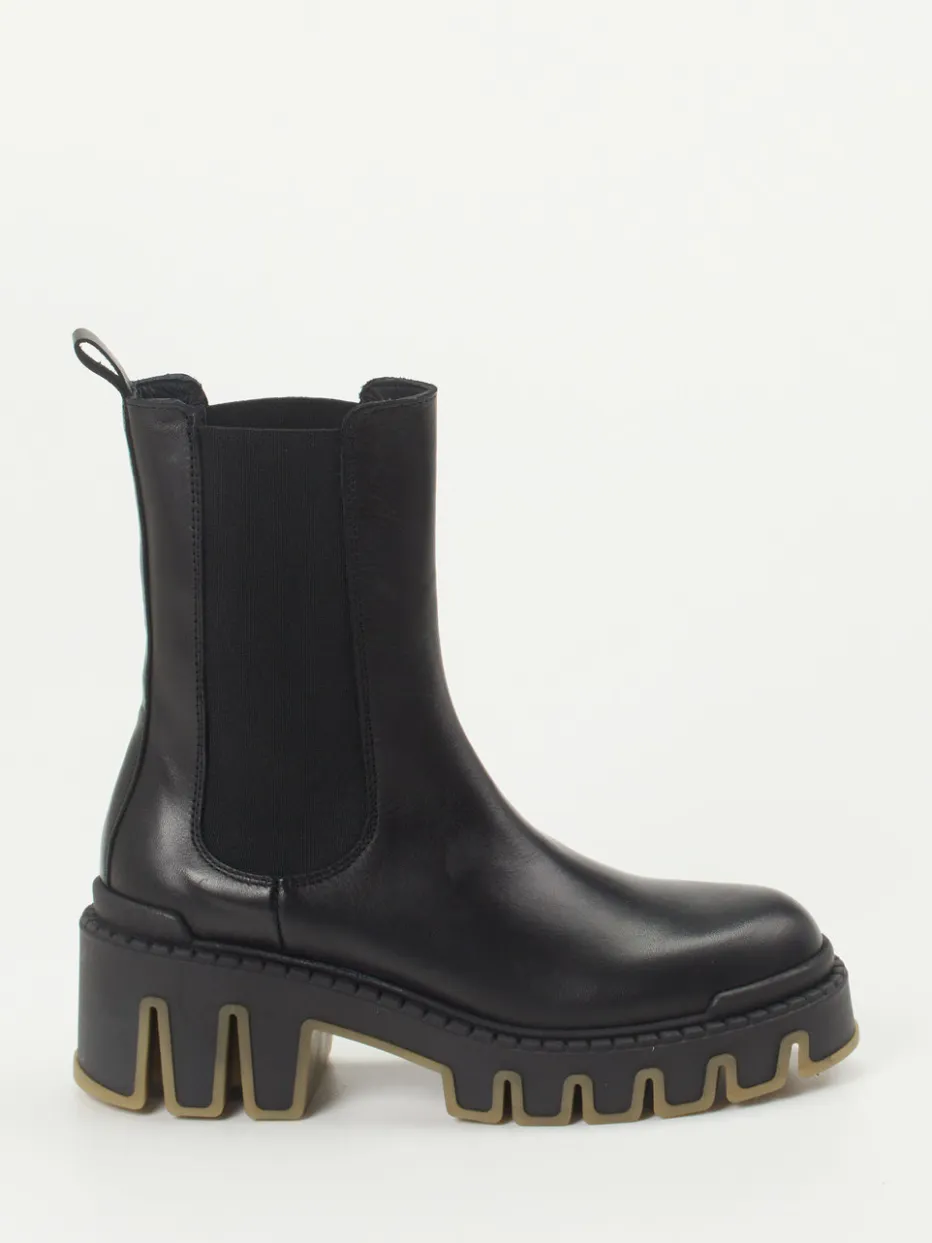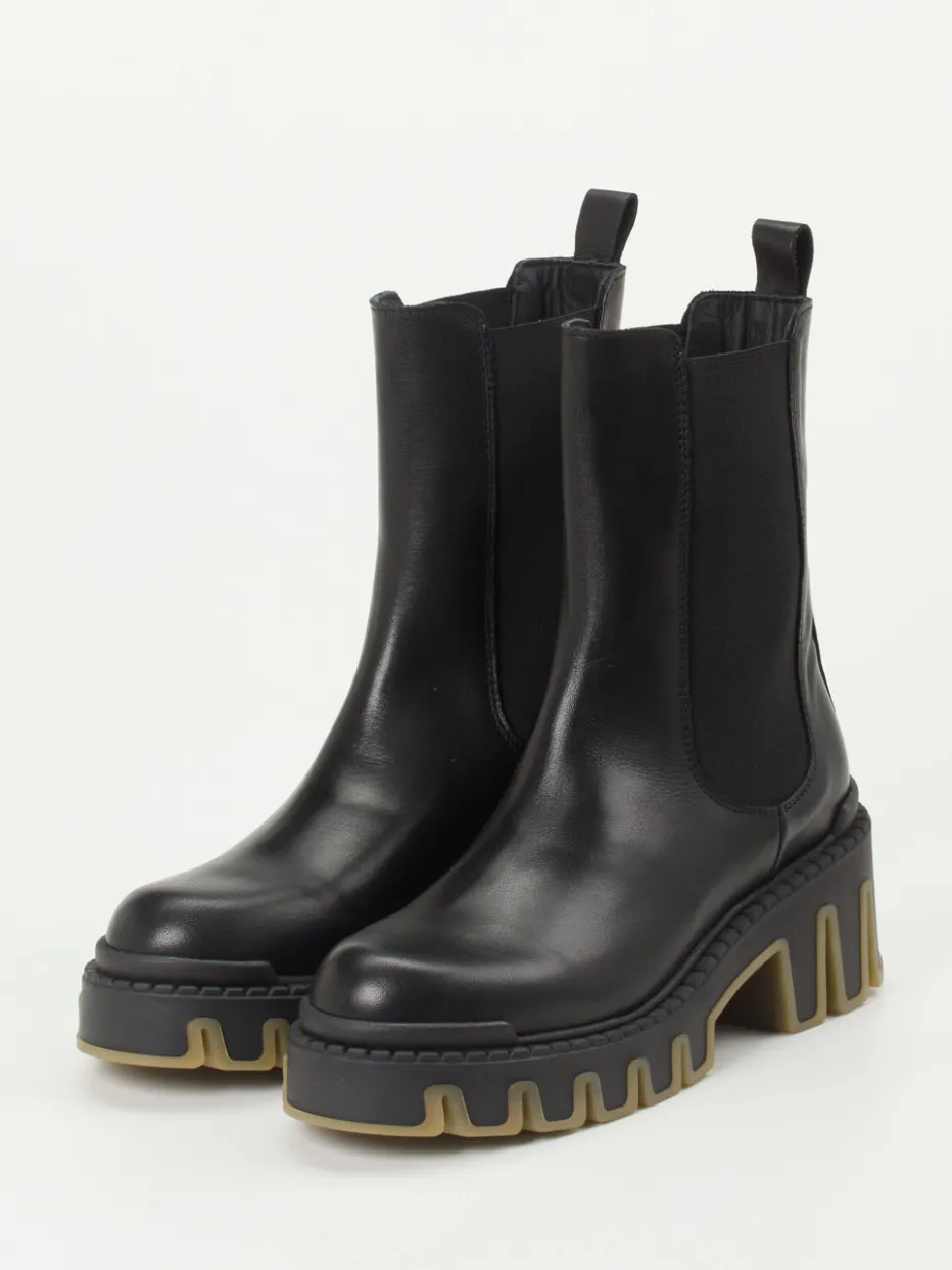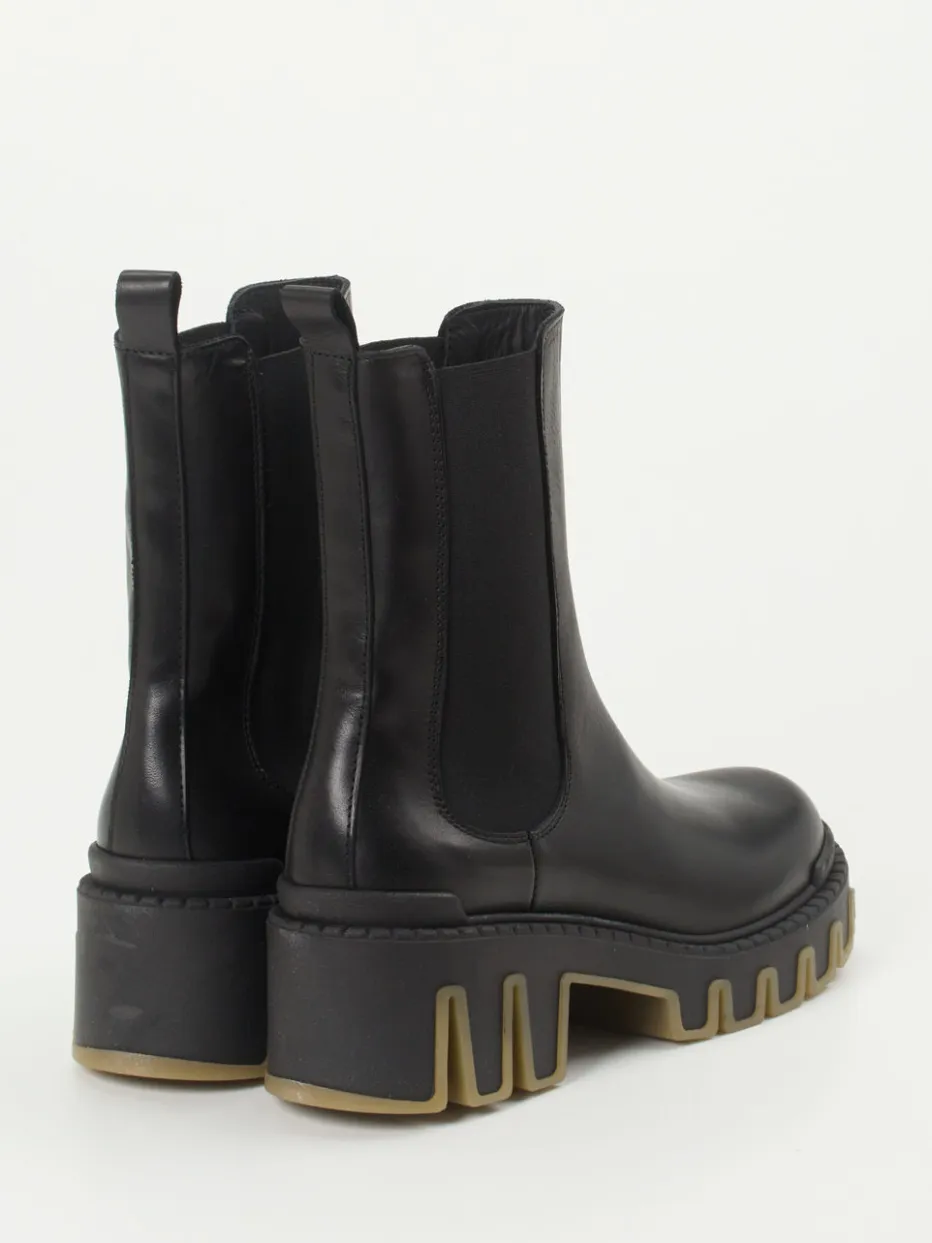 Chunky trifft Klassiker.Andrea Puccini präsentiert modische Chelsea Boots für Damen – designt für stilbewusste Auftritte zwischen Streetstyle und Understatement. Schwarzes, glänzendes Kalbleder und elastische Ton-in-Ton-Einsätze prägen die klassische Silhouette, ergänzt durch markante Zugschlaufen. Die honigfarbene, tief profilierte Chunky-Sohle aus Gummi setzt visuell starke Akzente und bietet zugleich sicheren Tritt bei urbane Aktivitäten. Der 5 cm hohe Absatz und das leicht gepolsterte Innenfutter garantieren Komfort an langen Tagen. Ideal zu Oversized-Mantel und Crossbody-Bag kombinierbar. Ein charakterstarker City-Boot mit trendfestem Design und hochwertiger Verarbeitung.