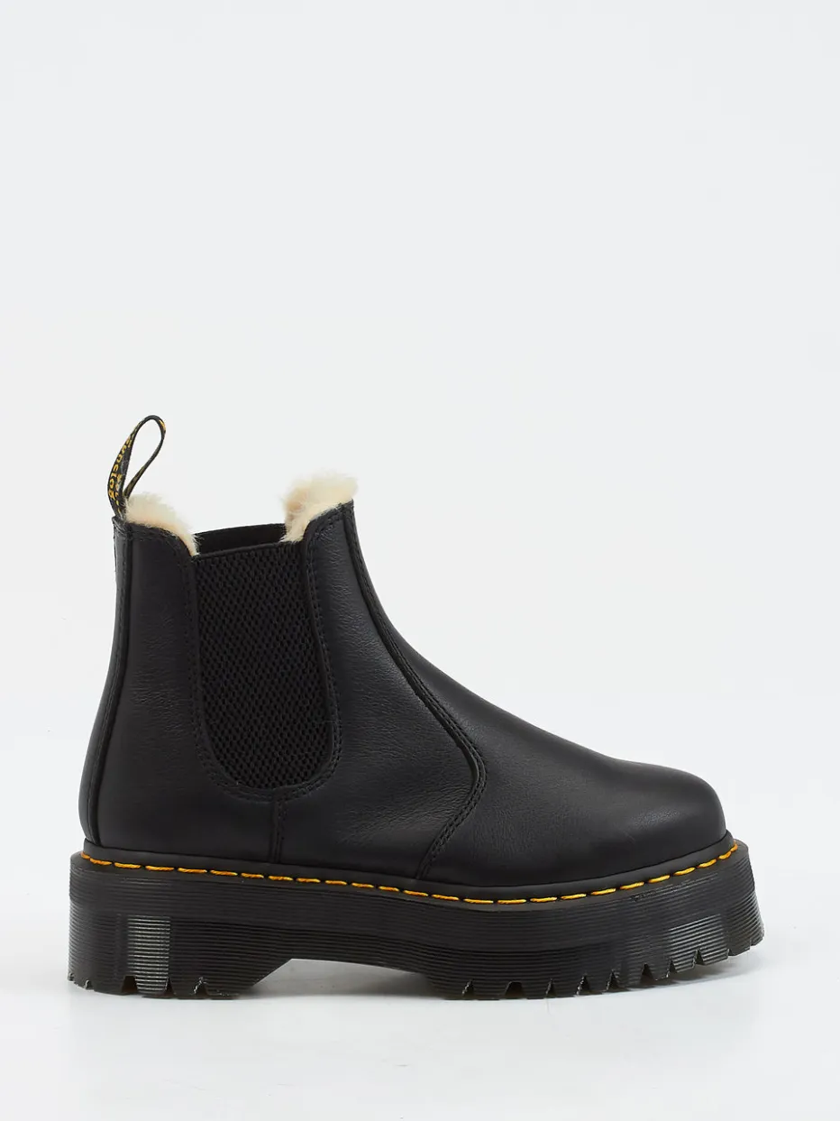 Wahre Kultboots neu interpretiert.Dr. Martens präsentiert mit diesen Damen-Chelsea Boots eine robuste Winterversion des Modells 2976 Quad. An frostigen Tagen bieten das fein genarbte Kalbleder mit Fettfinish sowie das warme Kunstfellfutter angenehmen Komfort. Die klassische schwarze Farbgebung trifft auf orangegelbe Kontrastnähte und eine markante, semitransparente Plateau-Gummisohle mit starkem Profil. Seitliche Elastikeinsätze und eine Zuglasche mit Logodruck betonen das typische Dr. Martens-Design. Inspiriert von Streetwear und Utility-Trends, eignen sich die Boots ideal für Alltag und Outdoor. Harmoniert mit Oversize-Mänteln oder einer Leder-Crossbody-Bag. Authentischer Winterstyle in kultiger Silhouette – mit unverkennbarem Docs-Charakter.