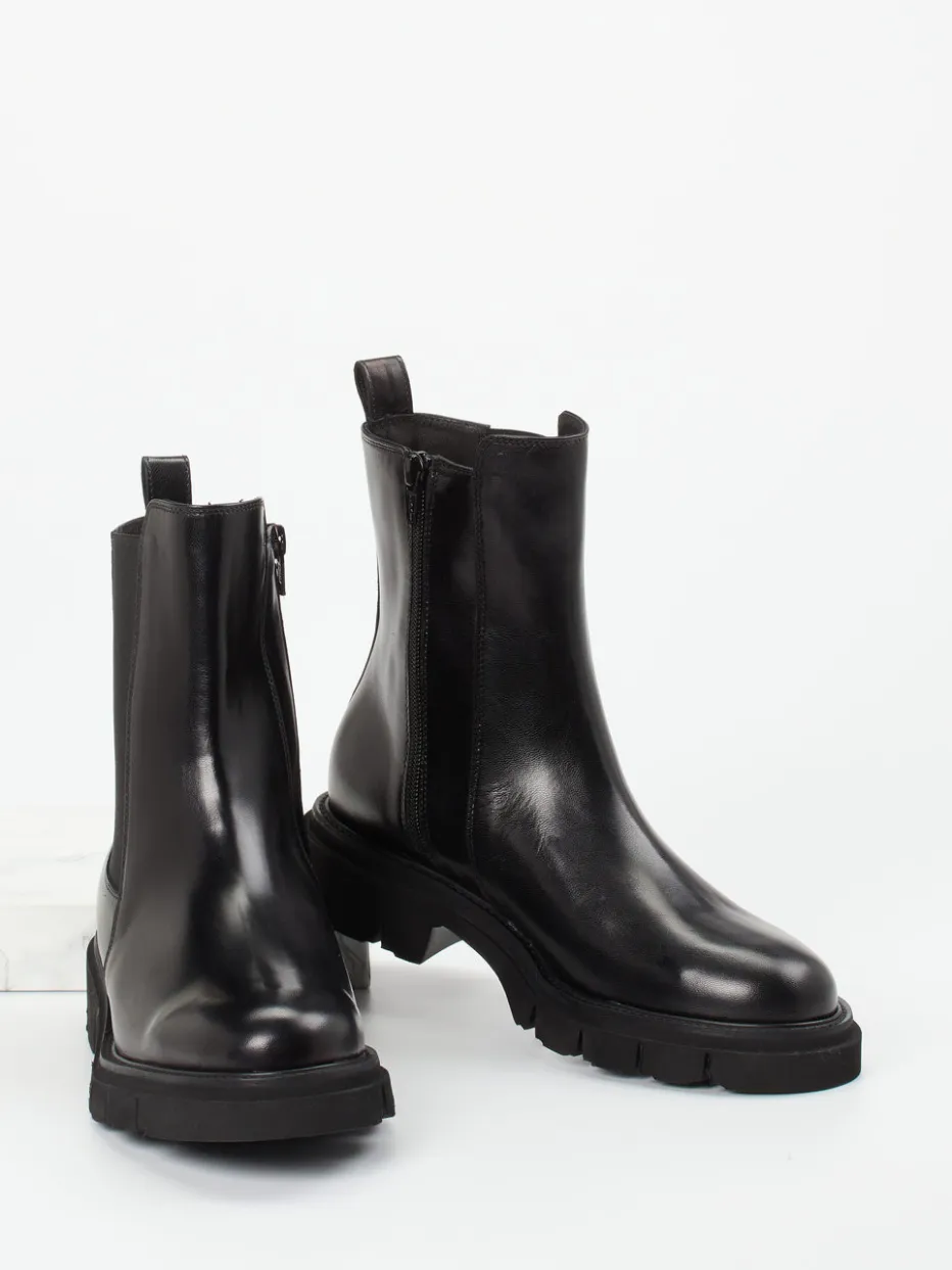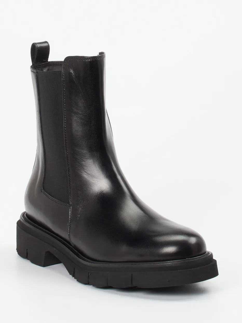 Ideal für den modernen Alltag zwischen Stadtbummel und Büro: Das schwarze Kalbleder zeigt sich in glänzender Ausführung und wirkt besonders edel. Ton-in-Ton gearbeitete Elastikeinsätze und seitliche Zuglaschen erleichtern das Anziehen. Die klobige Gummisohle im Heavy-Sole-Trend schenkt ein urbanes Finish und unterstützt ein angenehmes Laufgefühl – verstärkt durch das weiche Lederfutter. Die schmale Silhouette passt hervorragend zu Kaschmirmantel oder Hosen in Zigarettenform.