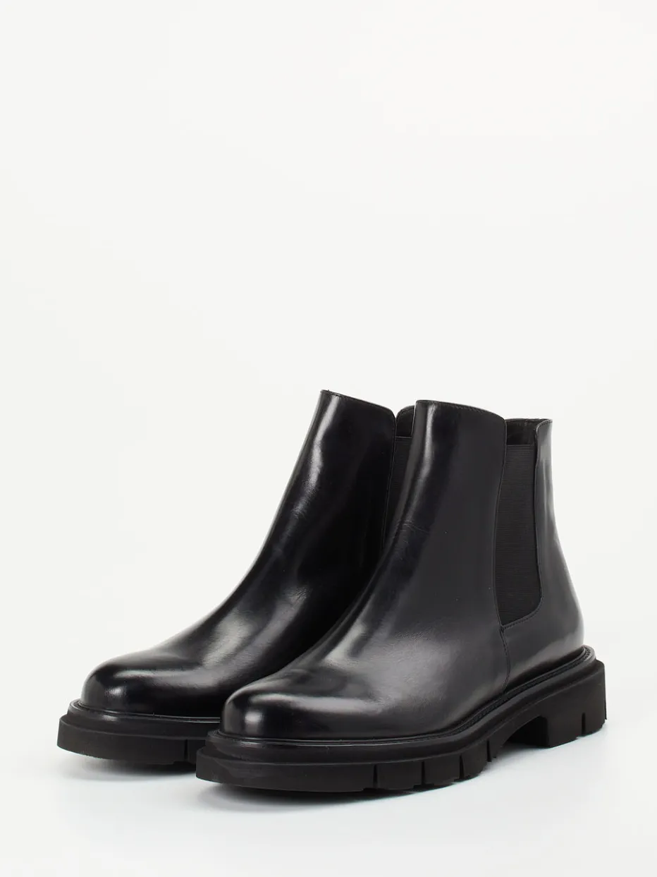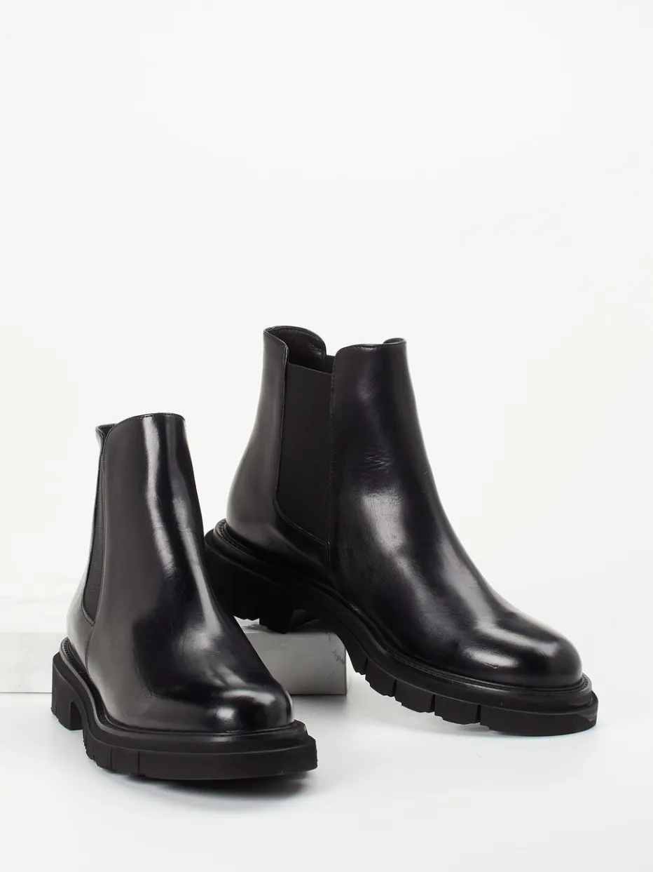 Kalbleder trifft auf Chunky Modernität.Die Marke Mannori zeigt bei diesen Damen-Chelsea-Boots stilistische Kompetenz und handwerkliche Qualität. Ideal für den urbanen Alltag oder das gepflegte Business-Outfit: Das glänzende Kalbleder in klassischem Schwarz verleiht dem Modell eine hochwertige Ausstrahlung, während die tonalen Elastikeinsätze für Komfort und typische Chelsea-Optik sorgen. Die knöchelhohe, puristische Silhouette liegt im Trend und wird durch die schwarze Chunky-Profilsohle betont. Ein sanftes Lederfutter aus Lammnappa und das weiche Lederfußbett garantieren zusätzlichen Tragekomfort. Ein vielseitiger Stilbaustein mit modernem Understatement – typisch Mannori.