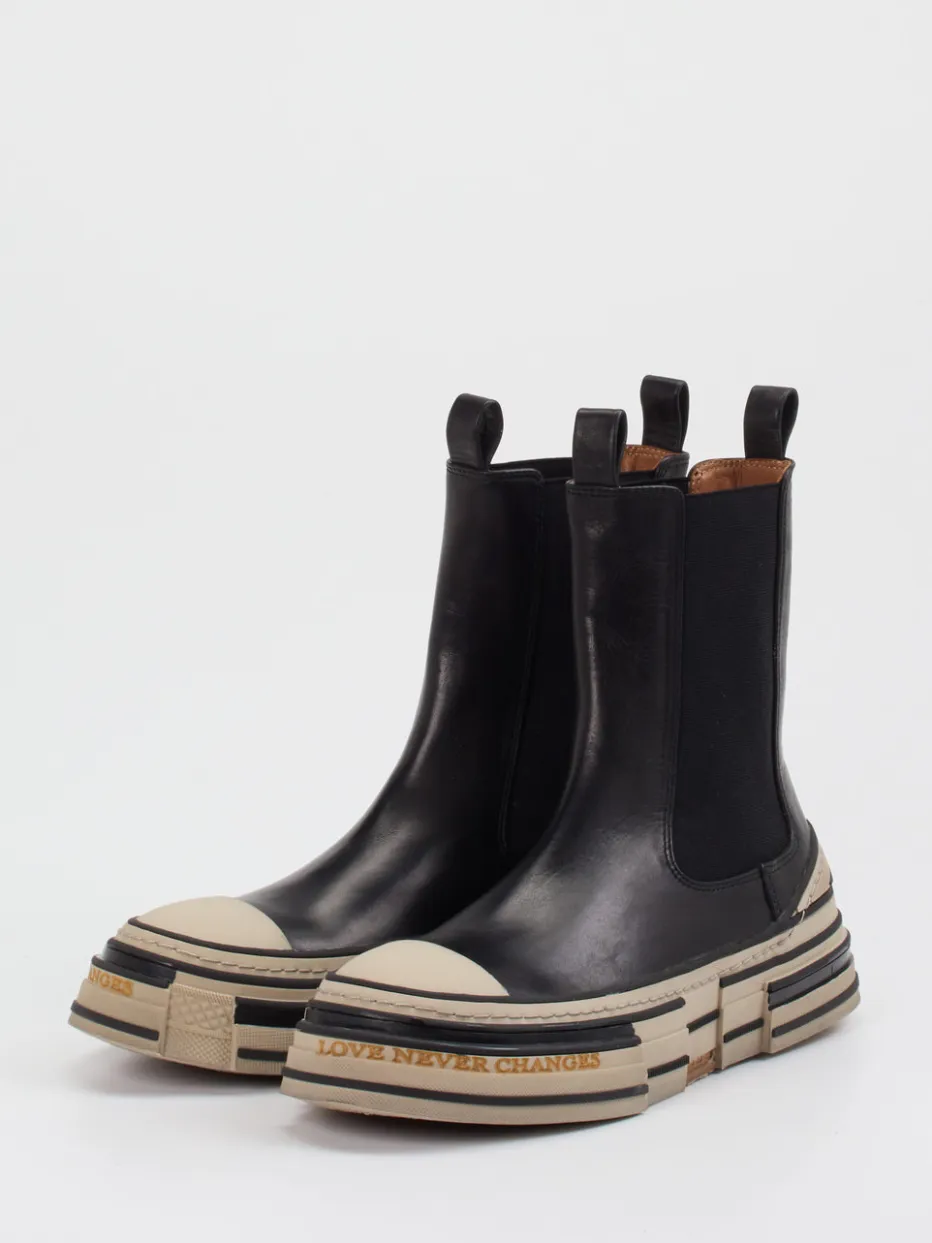 Diese Chelsea Boots von Rebecca White interpretieren klassische Linien neu – mit mattem Kalbleder, elastischen Einsätzen und einer expressiven Sohle mit Botschaft.