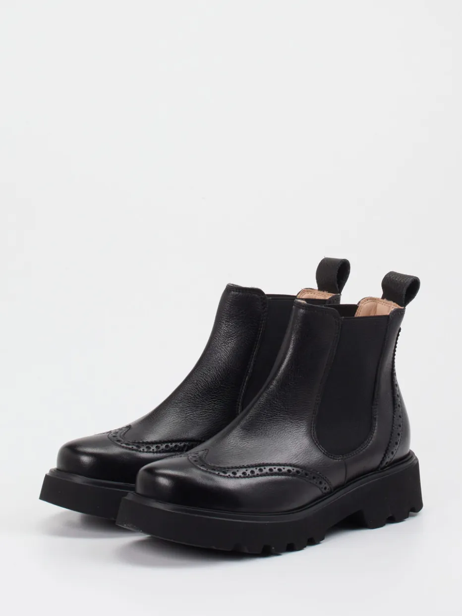 Herbststiefel mit Stilpotenzial.Die Marke Werner präsentiert mit diesen Chelsea Boots ein Modell für Damen, das gekonnt Tradition und urbanen Zeitgeist verbindet. Ideal für moderne Alltagslooks bei wechselhaftem Wetter: Gefertigt aus schwarzem Kalbleder mit genarbter Oberfläche, zeigen diese knöchelhohen Stiefeletten subtile Brogue-Verzierungen und eine markant profilierte Sohle – beide Ton-in-Ton gehalten. Seitliche Elastikeinsätze sorgen für bequemen Einstieg, eine Zuglasche hinten ergänzt das funktionale Design. Durch ihre kompakte Form und klare Linienführung bieten sie vielfältige Kombinationen von Streetwear bis Bürooutfit. Der aktuelle Chunky-Sole-Trend trifft hier auf Heritage-Elemente. Typisch Werner: Verlässliche Handwerkskunst in urbaner Formsprache.