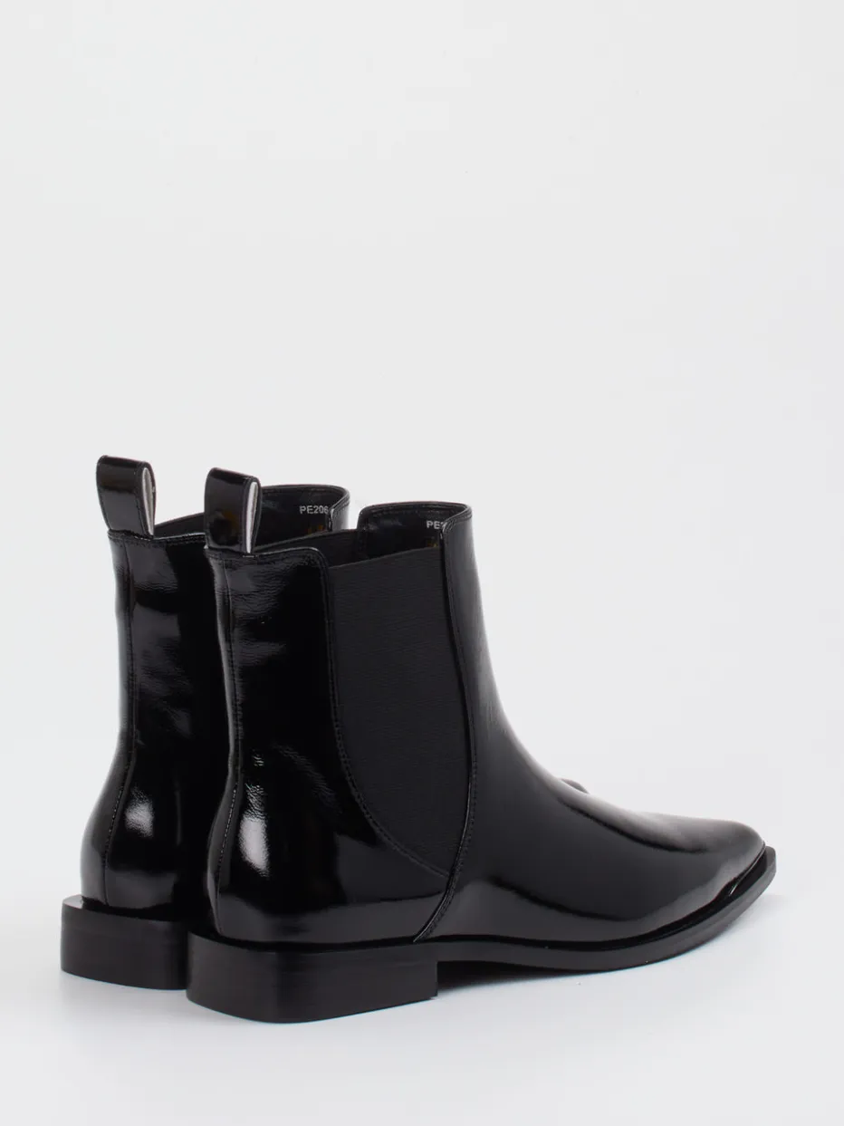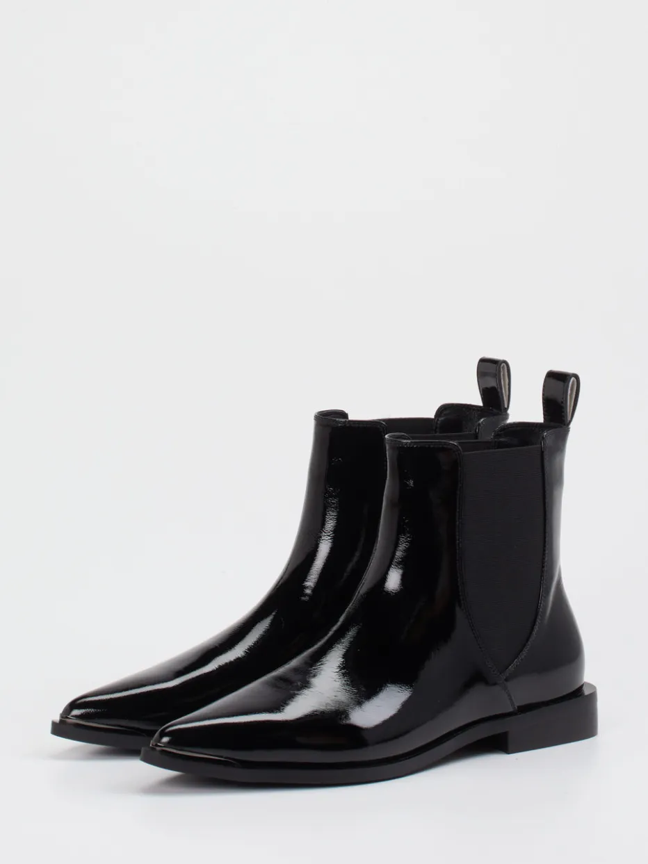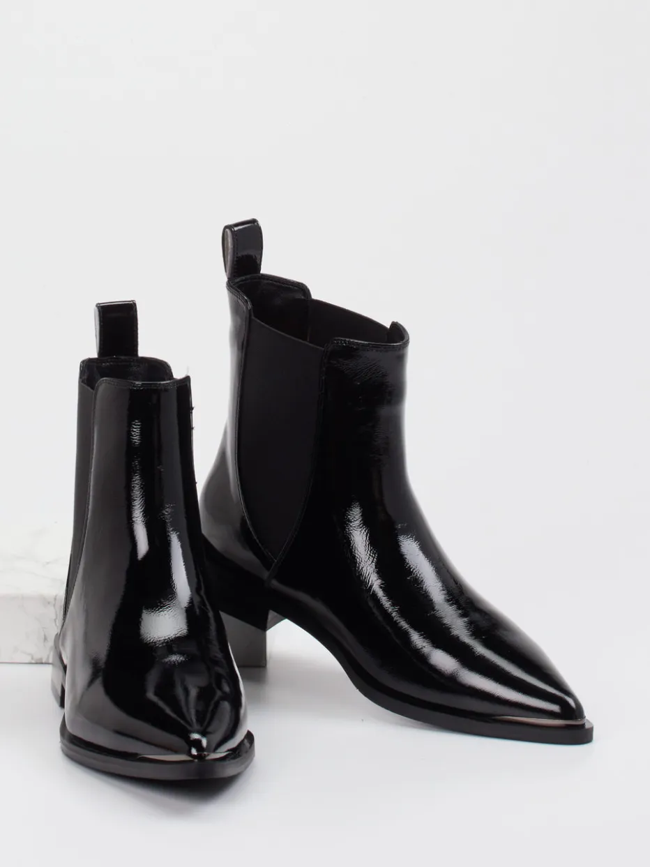 Hochglänzendes Lackleder, spitz zulaufende Front und eine elegante Linienführung verleihen diesem Chelsea-Modell eine edel-minimalistische Ausstrahlung mit 90s-Flair.