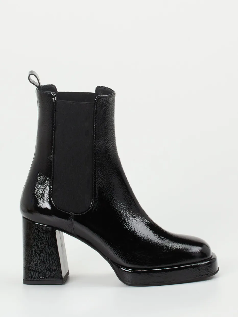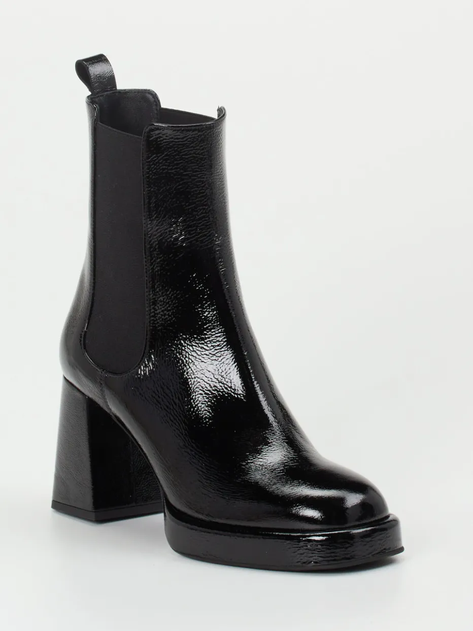 Diese Chelsea Boots verbinden glänzendes Lackleder mit markantem Blockabsatz und klarer Silhouette – ein Statement für urbanen Stil mit minimalistischer Präzision.