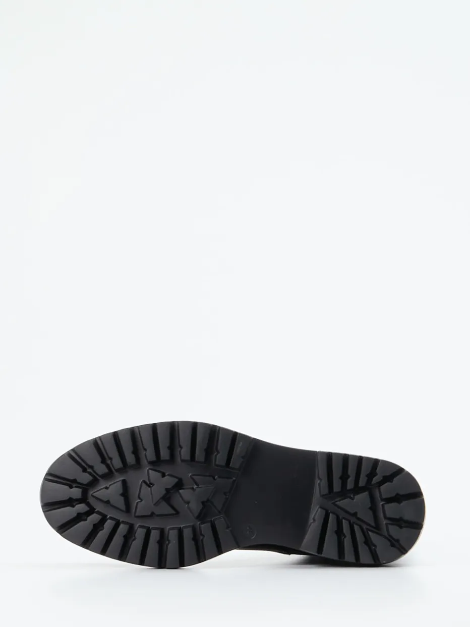 Schwarz trifft strukturiert.Konstantin Starke interpretiert klassische Chelsea Boots mit urbaner Präzision. Die knöchelhohen Damen-Stiefeletten aus schwarzem, glänzendem Lammleder überzeugen durch ihre klare Form und die seitlichen Elasteinsätze. Mit ihrer robusten, profilierten Gummisohle greifen sie den Heavy-Sole-Trend auf und bieten zugleich federleichten Komfort. Details wie die Zuglasche und Ton-in-Ton-Nähte fügen sich unauffällig ins minimalistische Gesamtbild ein – perfekt kombinierbar zu Wollmantel oder Business-Outfit. Ein stilorientierter Schuh mit subtiler Streetwear-Note – markant, komfortabel und zeitgemäß.