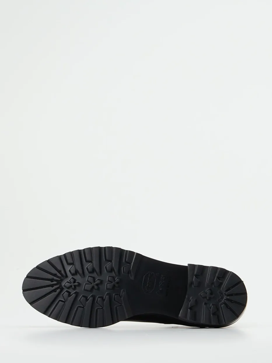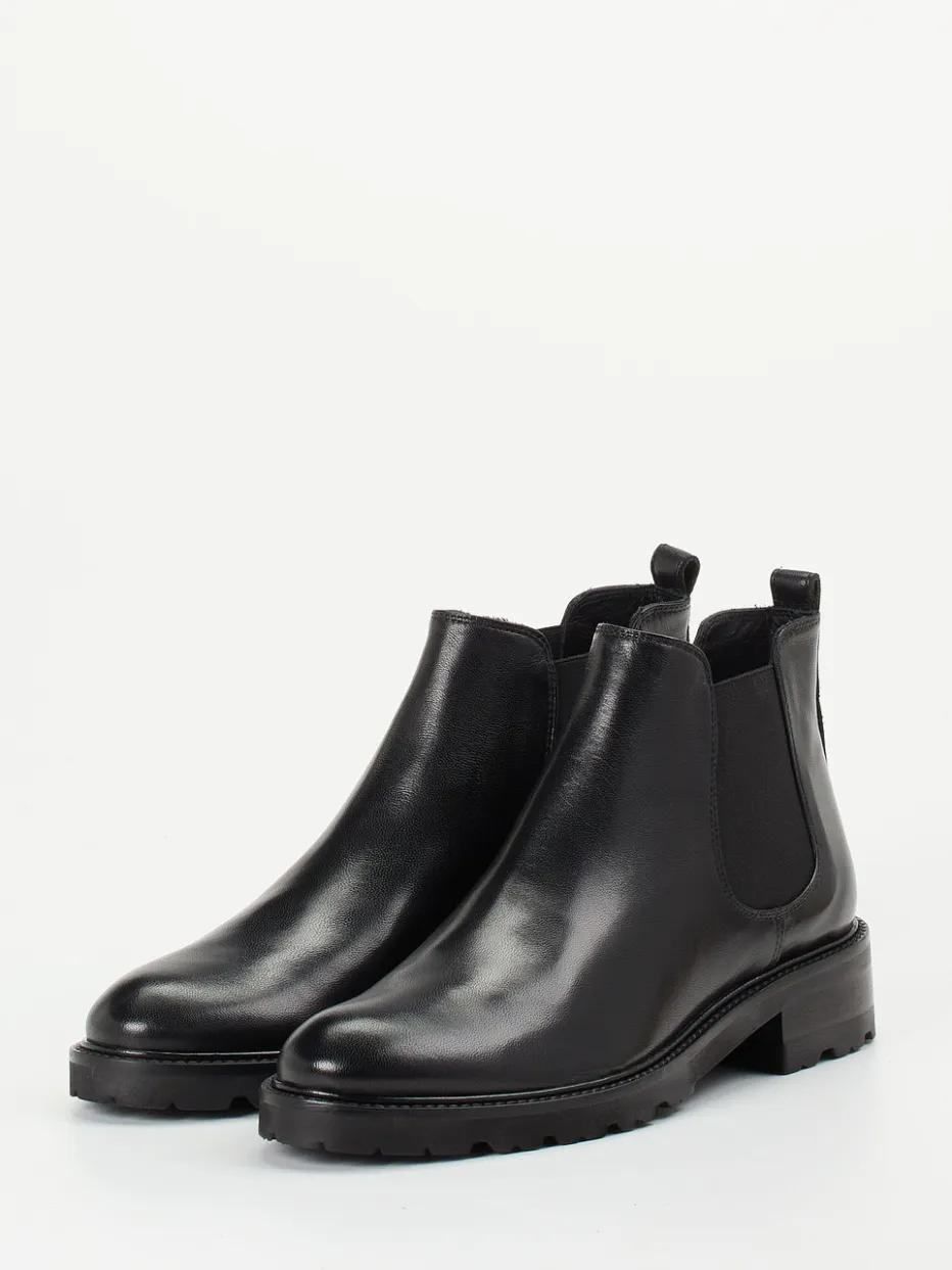 Perfekt für den Weg ins Büro oder den City-Bummel bieten sie mit schwarzem, glänzendem Lammleder und beidseitigen Ton-in-Ton-Elastikeinsätzen ein souveränes Erscheinungsbild. Die knöchelhohe, schmal zulaufende Silhouette wird durch eine robuste Gummisohle mit markantem Profil unterstrichen – im Trend der Heavy-Sole-Bewegung. Eine rückseitige Zuglasche erleichtert den Einstieg, die lederne Innenpolsterung steigert den Tragekomfort. Minimalistischer Chic trifft auf funktionalen Stil, ideal zu Wollmantel und Lederaccessoires.