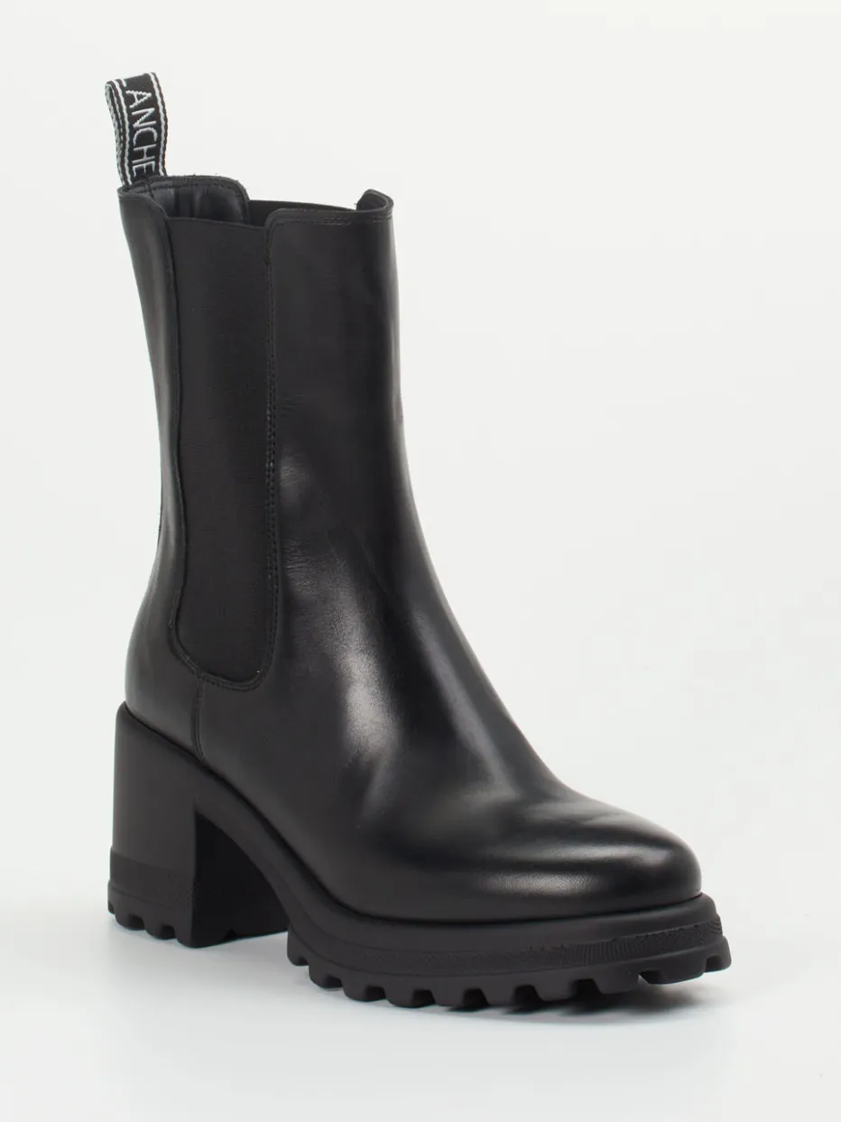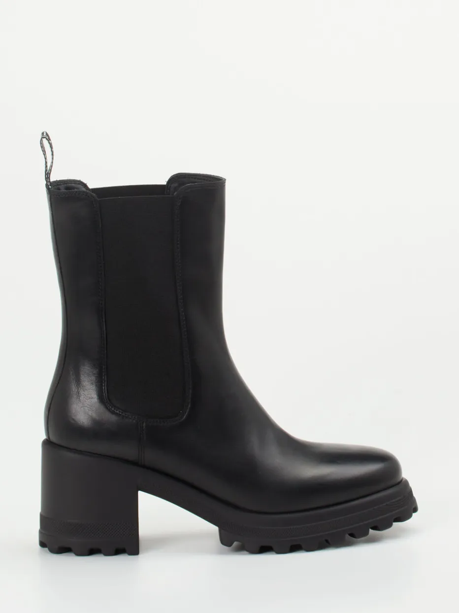 Ideal für einen souveränen Auftritt zwischen Büro und Freizeit: Das glänzend veredelte Lammleder in tiefem Schwarz unterstreicht die minimalistische Linie. Klassisch-knöchelhoch geschnitten, mit beidseitigen Elastikeinsätzen und Zuglasche samt Logo-Schriftzug, lassen sich die Boots bequem hineinschlüpfen. Die robuste Gummiprofilsohle mit 7 cm Blockabsatz ergänzt nicht nur den angesagten Chunky-Look, sondern sorgt auch für erhöhten Tragekomfort. Ein Modell, das modische Klarheit mit urbaner Nonchalance vereint – kombinierbar zu Wide-Leg-Hosen wie Strickkleidern.