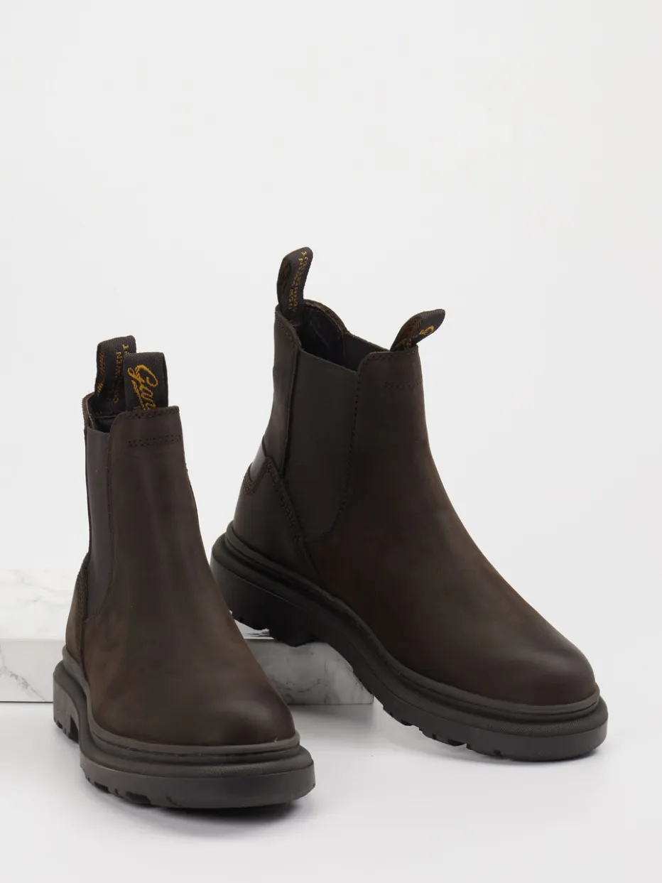 Stilsicher durch die kalte Jahreszeit. Gant interpretiert die klassische Stiefelette als hochwertig gearbeiteten Chelsea Boot. Für unbeständige Herbsttage oder entspannte Stadtbesuche bietet das Modell Schutz und Komfort. Das dunkelbraune Leder zeigt eine matte Oberfläche und verbindet mit dem elastischen Einsatz sowie den charakteristischen Zuglaschen in Kontrastfarbe funktionale Details mit urbaner Ästhetik. Die kräftige Gummisohle mit tiefem Profil sorgt für Trittsicherheit und rundet die klassische, knöchelhohe Silhouette ab. Der Utility-Style wird durch minimalistische Workwear-Elemente betont – ideal für casual-orientierte Outfits. Kombiniert mit Thermosocken und Outdoorjacke ergibt sich ein stimmiges Gesamtbild. Robustheit, Stil und Komfort im markentypisch klaren Gant-Design.