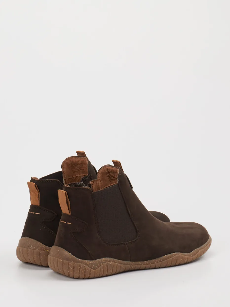 Vielseitiger Alltagsbegleiter mit natürlicher Ausstrahlung. Josef Seibel präsentiert diese Damen-Chelsea Boots für entspannte Herbsttage. Das Modell kombiniert pflegeleichtes Leder mit matter, veloursartiger Oberfläche und tritt in einem warmen Dunkelbraun auf, ergänzt um cognacfarbene Akzente an den Zuglaschen. Der knöchelhohe Schnitt mit runder Spitze, tonalen Nähten und seitlichen Elastikeinsätzen wird durch einen Innenreißverschluss praktisch ergänzt. Die strukturierte Gummisohle sorgt für Trittsicherheit und unterstützt den bequem-legeren Charakter. Ideal für Casualwear im „Comfort Core“-Trendspektrum. Kombiniert mit Cord oder Denim ergibt sich ein stimmiger Herbstlook. Flexible Materialien, klare Silhouette und Alltagstauglichkeit zeichnen dieses Modell markentypisch aus.