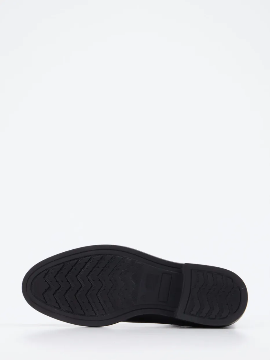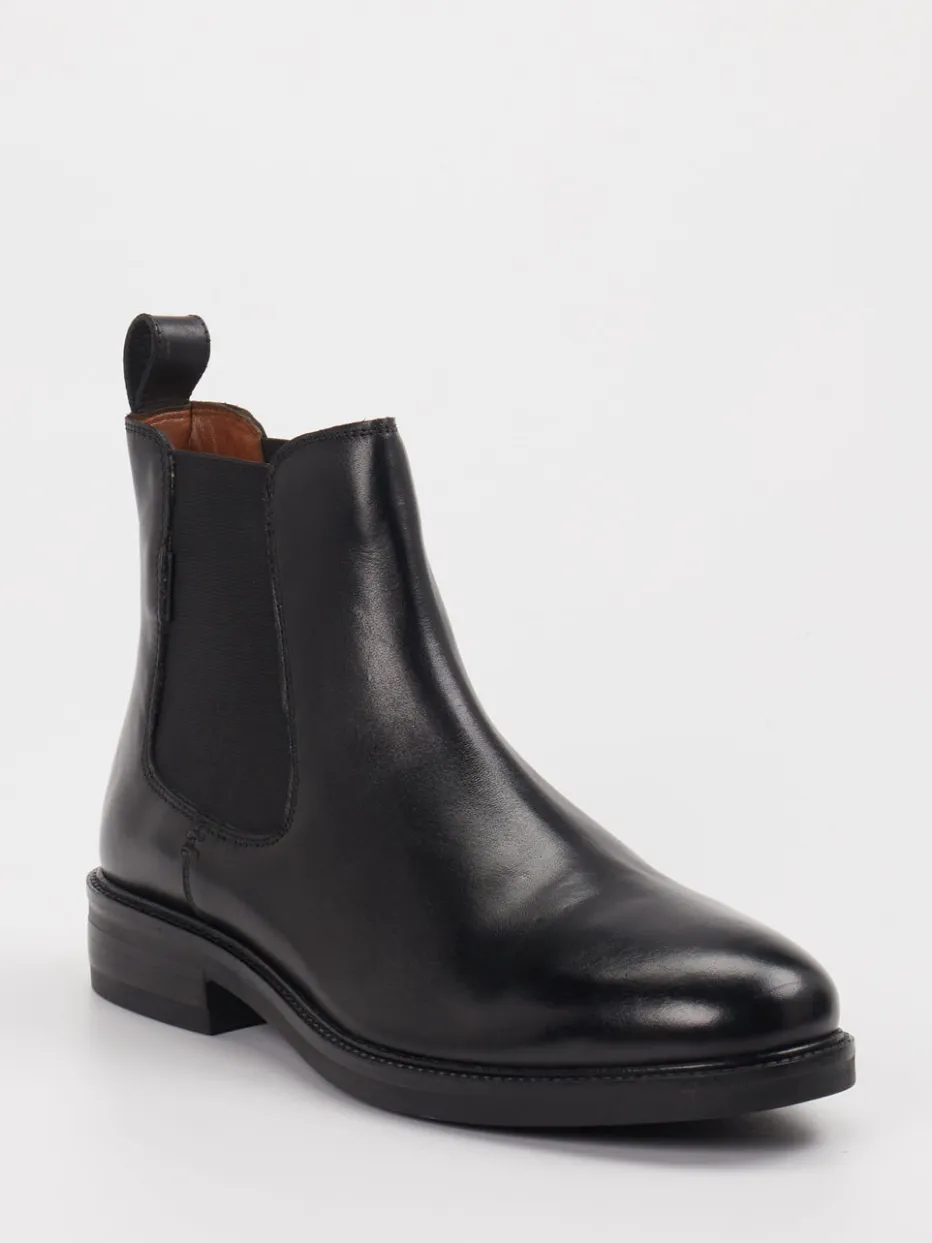Stilvoller Klassiker für jeden Tag. Daniel Kenneth präsentiert mit diesen Chelsea Boots ein elegantes Herrenmodell für Business und Alltag. Das glatte, leicht glänzende Leder trifft auf eine klassische, knöchelhohe Silhouette in tiefem Schwarz. Elastikeinsätze an den Seiten und eine dezente Zuglasche erleichtern den Einstieg, während die schwarze Gummisohle mit strukturiertem Profil sicheren Halt bietet. Ton-in-Ton-Nähte und ein minimalistisches Finish unterstreichen den „Quiet Luxury“-Ansatz. Besonders passend zu Wollmantel und schwarzem Ledergürtel. Ein Chelsea Boot mit zeitlosem Understatement und geschmackvollem Minimalismus.