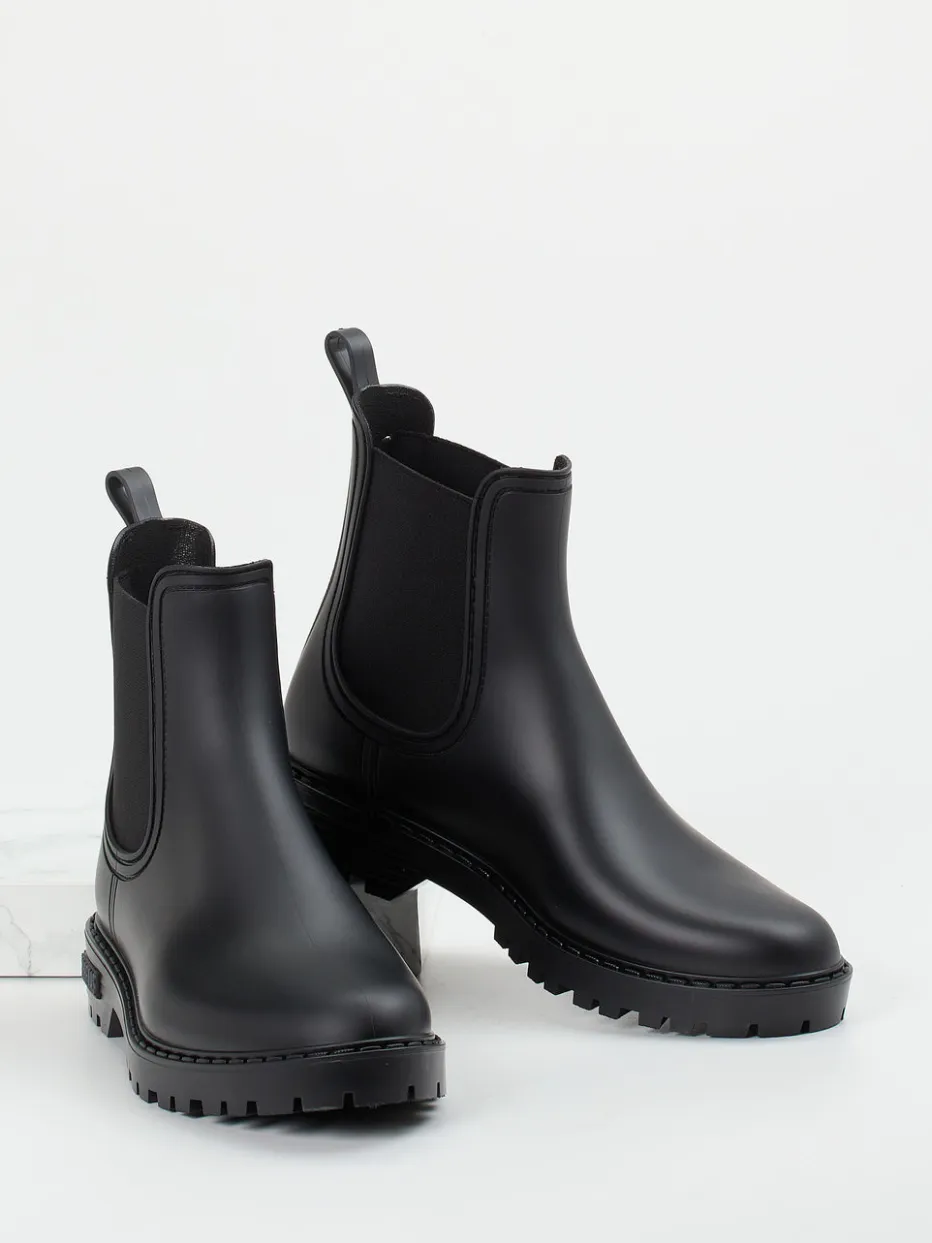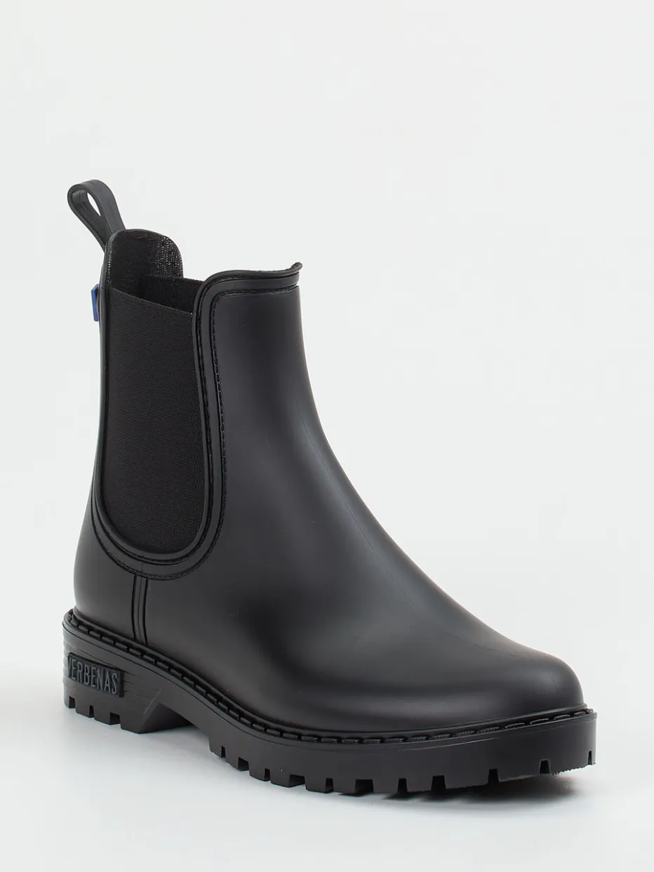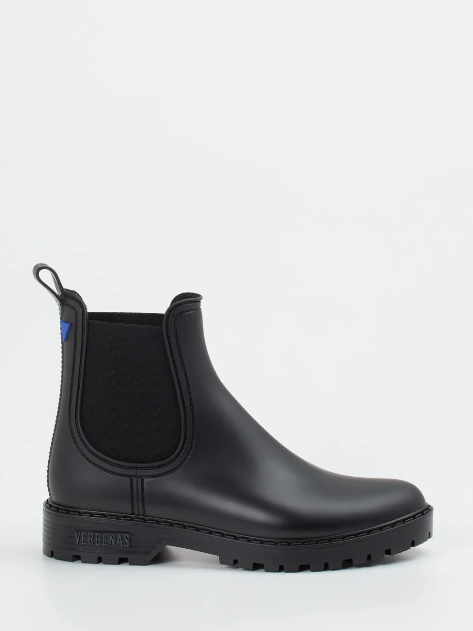 Minimalistisch, praktisch, wasserdicht.Die spanische Marke Verbenas interpretiert klassische Chelsea Boots neu: Diese unisex Stiefelette aus schwarzem Synthetik begleitet durch verregnete Herbsttage. Gefertigt aus mattem, wetterbeständigem Gummi überzeugt das Modell durch seine schlanke, knöchelhohe Silhouette mit tonigen Elastikeinsätzen und Zuglasche. Das Innenfutter aus weichem Textil sorgt für bequemen Komfort, während die griffige Profilsohle sicheren Halt bietet. Optische Highlights bilden das integrierte Markenlogo und eine blaue Akzent-Applikation am Schaft. Passt zu Streetwear, Regenoutfits oder minimalistischen Alltagslooks. Vegan, pflegeleicht und mit funktionalem City-Charakter – Verbenas kombiniert Stil mit Alltagstauglichkeit.