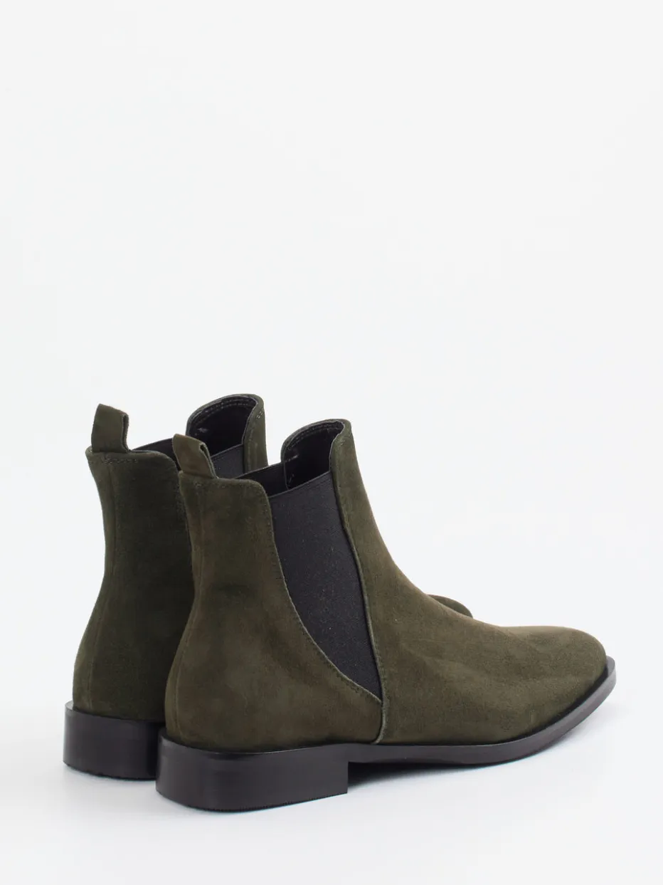 Ideal für Alltag und Büro verbinden die Boots waldgrünes Veloursleder mit samtig-matter Oberfläche und schwarzen Elastikeinsätzen. Der spitz zulaufende Leisten unterstreicht den femininen Anspruch, während die profilierte Gummisohle mit 2,5 cm Absatz Stabilität liefert. Die dezente Ton-in-Ton-Nahtführung und rückseitige Zuglasche fügen sich perfekt in den minimalistischen Look. Kombinierbar zu Jeans wie zu feinen Wollhosen, begleitet dieses Modell souverän durch herbstliche Styling-Situationen.