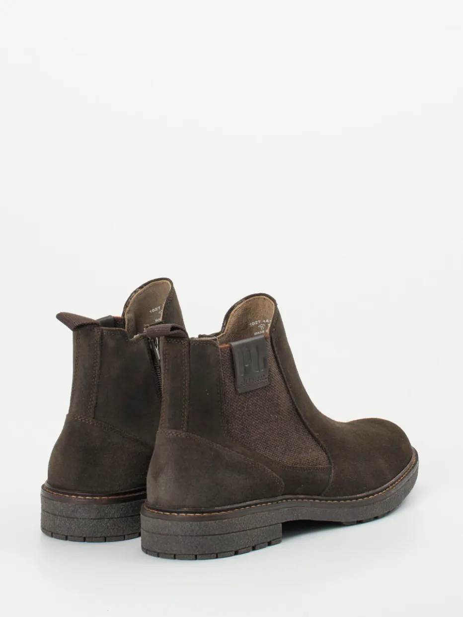Dieser Chelsea Boot kombiniert hochwertiges Veloursleder in Dunkelbraun mit funktionalen Details wie Reißverschluss und Profilsohle – perfekt für stilbewusste Herren im Alltag und Büro.