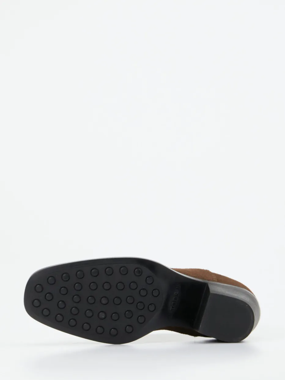 Ein Klassiker im Western-Chic.Tod’s präsentiert mit diesen Chelsea Boots ein handgefertigtes Damenmodell aus schokoladenbraunem Veloursleder. Ideal für den Business-Alltag und stilvolle Herbstspaziergänge: Das samtig angeschliffene Veloursleder trifft auf elastische Einsätze, eine praktische Zuglasche und goldfarbenes Logo-Detail an der Ferse. Die knöchelhohe Silhouette mit profilierter Gummisohle und 6 cm hohem Blockabsatz verbindet Komfort mit femininer Linienführung. Dezenter Western-Einfluss und ruhige Farbgebung positionieren das Modell stilistisch im Quiet-Luxury-Trend. Zeitlose Vielseitigkeit mit dem Anspruch italienischer Meisterfertigung.