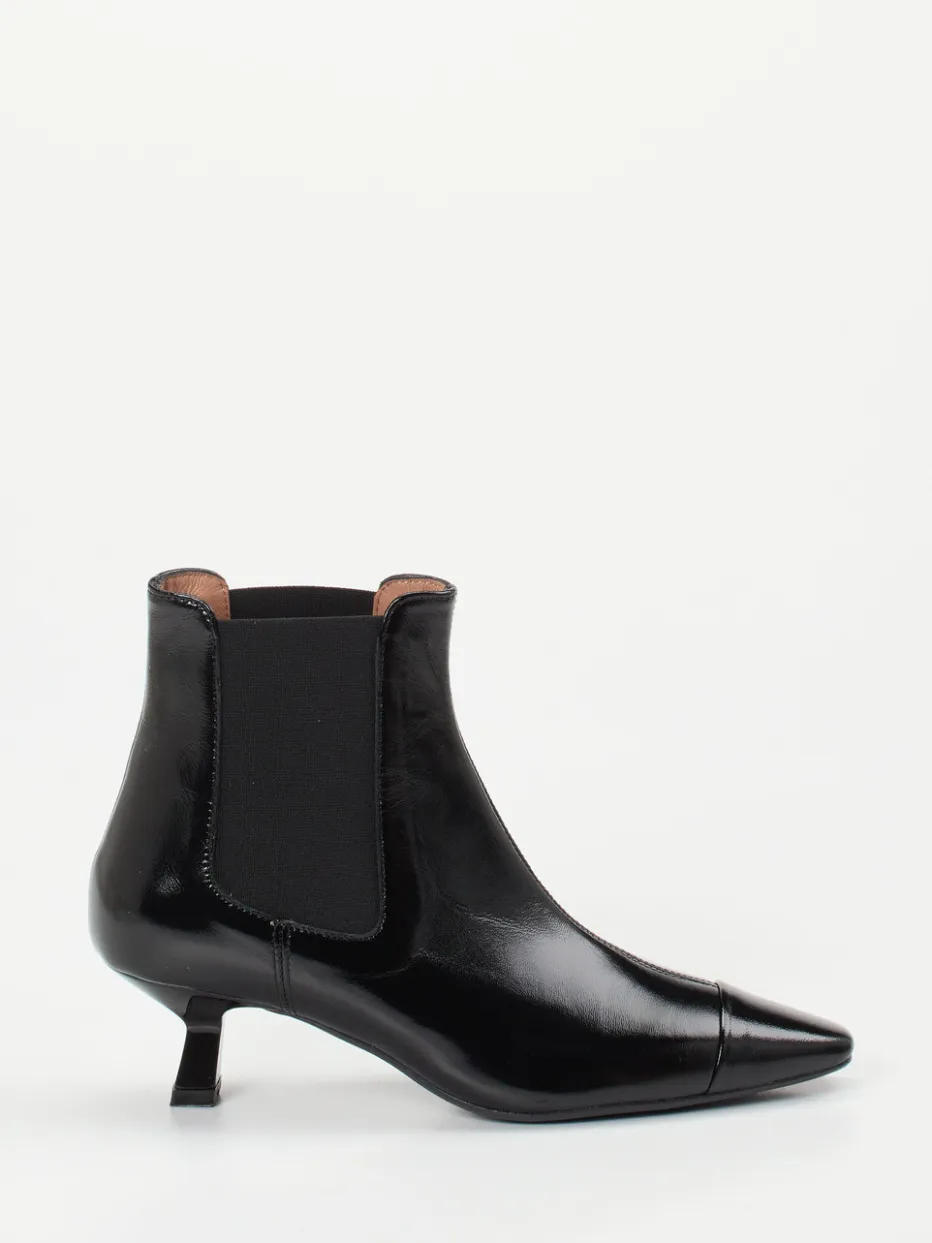 Die Kombination aus glänzendem Lackleder, spitzer Form und Kitten-Heel verleiht dieser Chelsea-Stiefelette einen stilvollen Auftritt mit Retro-Flair. Minimalismus trifft auf modernen Business-Chic.