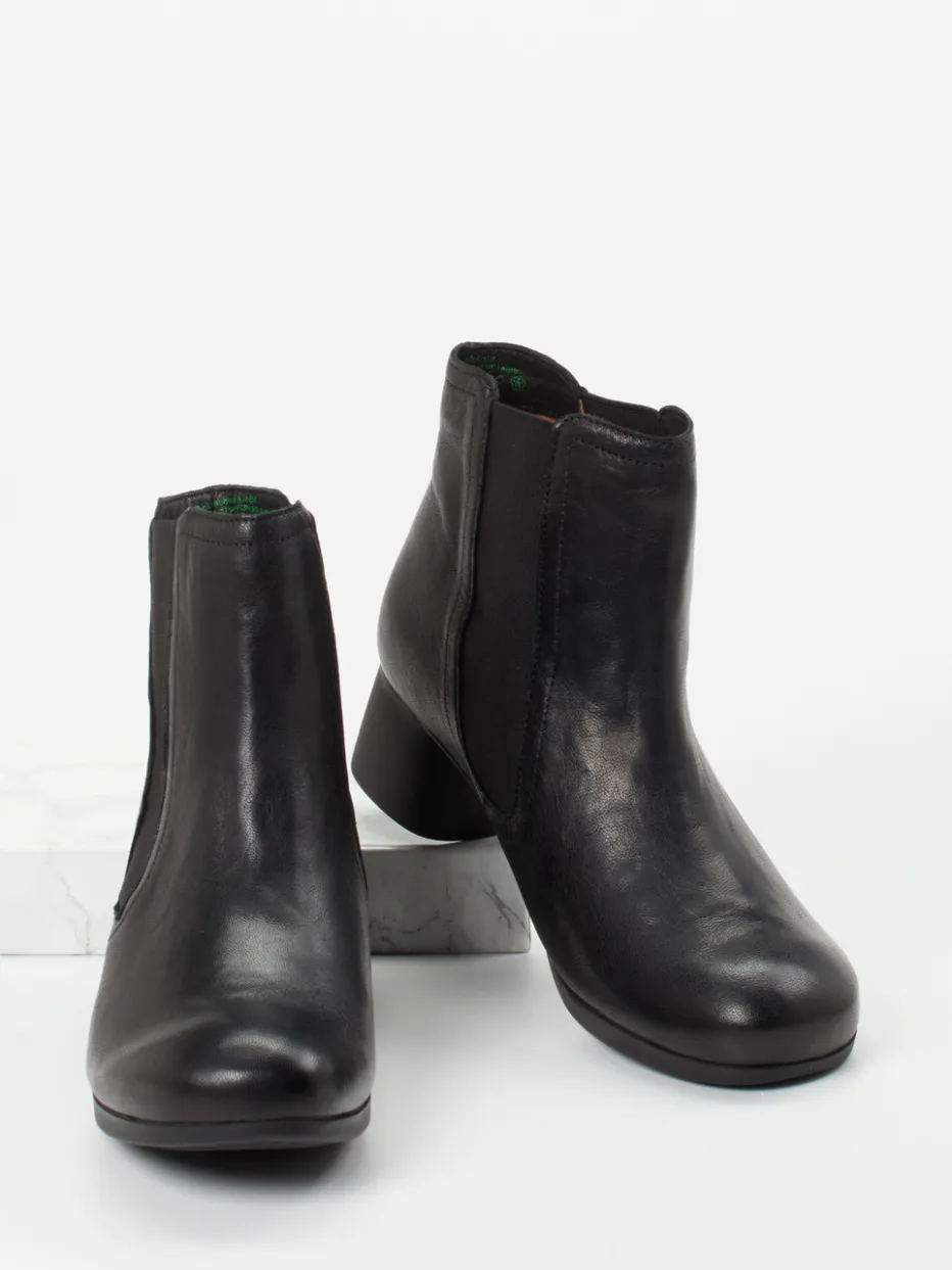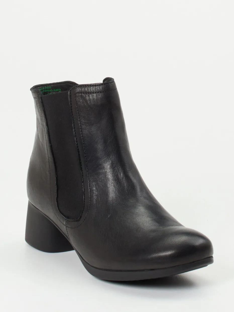 Schwarz. Schlicht. Vielseitig.Die Marke Think interpretiert die Chelsea-Stiefelette als stiltypisch femininen Alltagsbegleiter mit Komfortfaktor. Ob Büro oder Freizeit – das tiefschwarze Lammleder mit matter Oberfläche verleiht dieser knöchelhohen Schlupfstiefelette subtile Eleganz. Tonale Elastikeinsätze und ein abgerundeter Leisten harmonieren mit dem formschönen 4-cm-Blockabsatz. Das ledergefütterte Innenleben samt herausnehmbarem Korkfußbett sorgt für passgenauen Komfort. Die profilierte Gummisohle unterstützt sicheren Halt bei jedem Schritt. Im Look dominiert moderner Minimalismus, passend zu „Quiet Luxury“ und „Comfort Elegance“. Ein rundum komfortables Modell mit stilprägender Schlichtheit aus dem Hause Think.