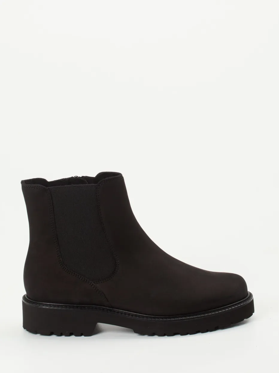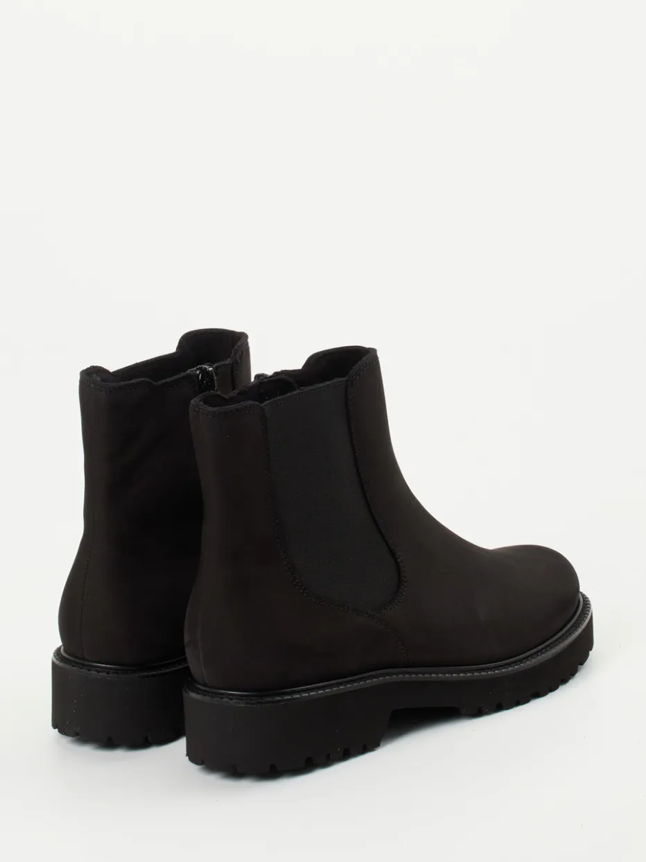 Klarer Look mit urbaner Stärke.Semler präsentiert eine schwarze Chelsea-Stiefelette aus Nubukleder in der Linie Barbara. Ob für Büro, Alltag oder Citytrips – das matte, samtig angeschliffene Nubukleder sorgt für ein angenehmes Tragegefühl und schafft gemeinsam mit dem elastischen Einsatz und dem seitlichen Ton-in-Ton-Reißverschluss einen eleganten Look. Die knöchelhohe Silhouette mit abgerundeter Front wird durch das cleane Design und dezente Rahmenziernähte unterstrichen. Die griffig profilierte Leichtzellsohle bringt Stabilität bei wechselhaften Bedingungen und folgt dem Trend zu Chunky Sohlen mit Stil. Sehr gut kombinierbar mit monochromen Outfits und feinen Materialien. Perfekt für komfortbewusste Looks mit dezentem modischen Akzent.
