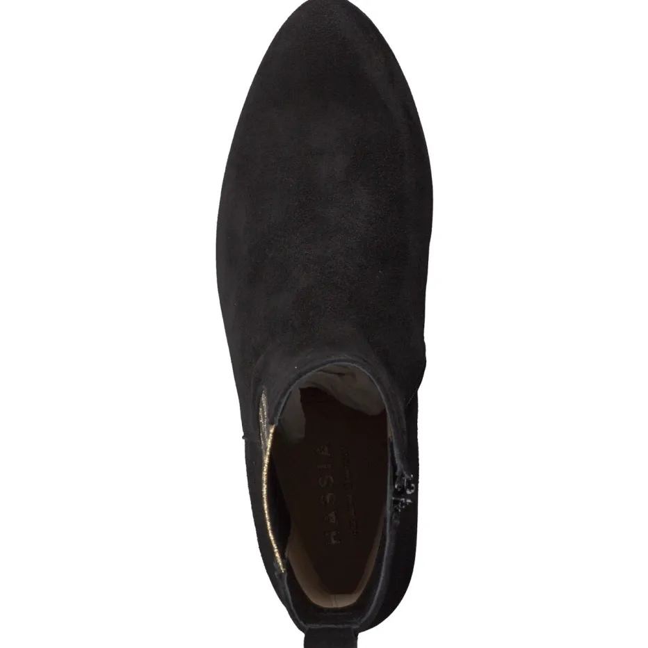 Stil trifft Komfort im Every-Day-Favoriten.Die Marke Hassia präsentiert mit dieser Damen-Stiefelette eine moderne Interpretation des Chelsea-Boots. Für Büroalltag und City-Termine bietet das Modell mit schwarzem Veloursleder, samtiger Oberfläche und H-Weite optimalen Komfort. Der elastische Einsatz mit goldfarbenem Hahnentrittmuster setzt ein dezentes Statement. Durch den praktischen Reißverschluss ist der Einstieg mühelos. Ein bezogener Blockabsatz mit rutschhemmender Gummisohle kombiniert Stil und Funktionalität. Der Look wirkt herbstlich-elegant und ergänzt sowohl klassische Businesskleidung als auch gehobene Freizeitoutfits. Hassia steht für modischen Anspruch mit orthopädischem Mehrwert – überzeugend stilvoll.