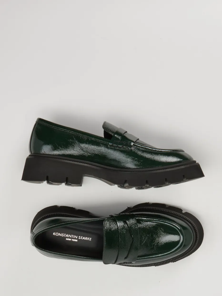 Glanz trifft auf architektonische Sohle.Konstantin Starke präsentiert mit diesem Damen-Loafer ein Modell, das modernen Minimalismus mit modischer Präsenz vereint. Für Tage, an denen bequemer Chic und Stilbewusstsein gleichermaßen gefragt sind, bietet dieser Slipper mit seiner gepolsterten Innensohle und dem soften Ziegenlederfutter angenehmen Komfort. Das tannengrüne Lackleder zeigt sich glänzend und strukturiert, ergänzt durch Ton-in-Ton-Nähte und einen klassischen Pennyschlitz auf dem Riegel. Die schwarze, profilierte Plateausohle aus Leichtzell rundet das breite, markante Design im Streetwear-inspirierten Look ab – ein klarer Vertreter des Chunky Loafer Trends der Saison. In Kombination mit Anzughose oder Culotte ein urbaner Blickfang. Ein stilistisch pointierter Schuh mit luxuriösem Finish und alltagstauglicher Formgebung.