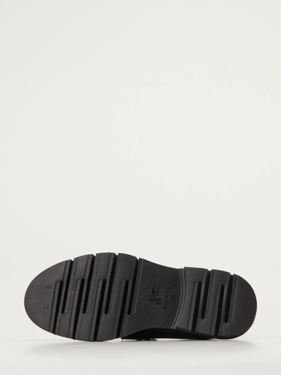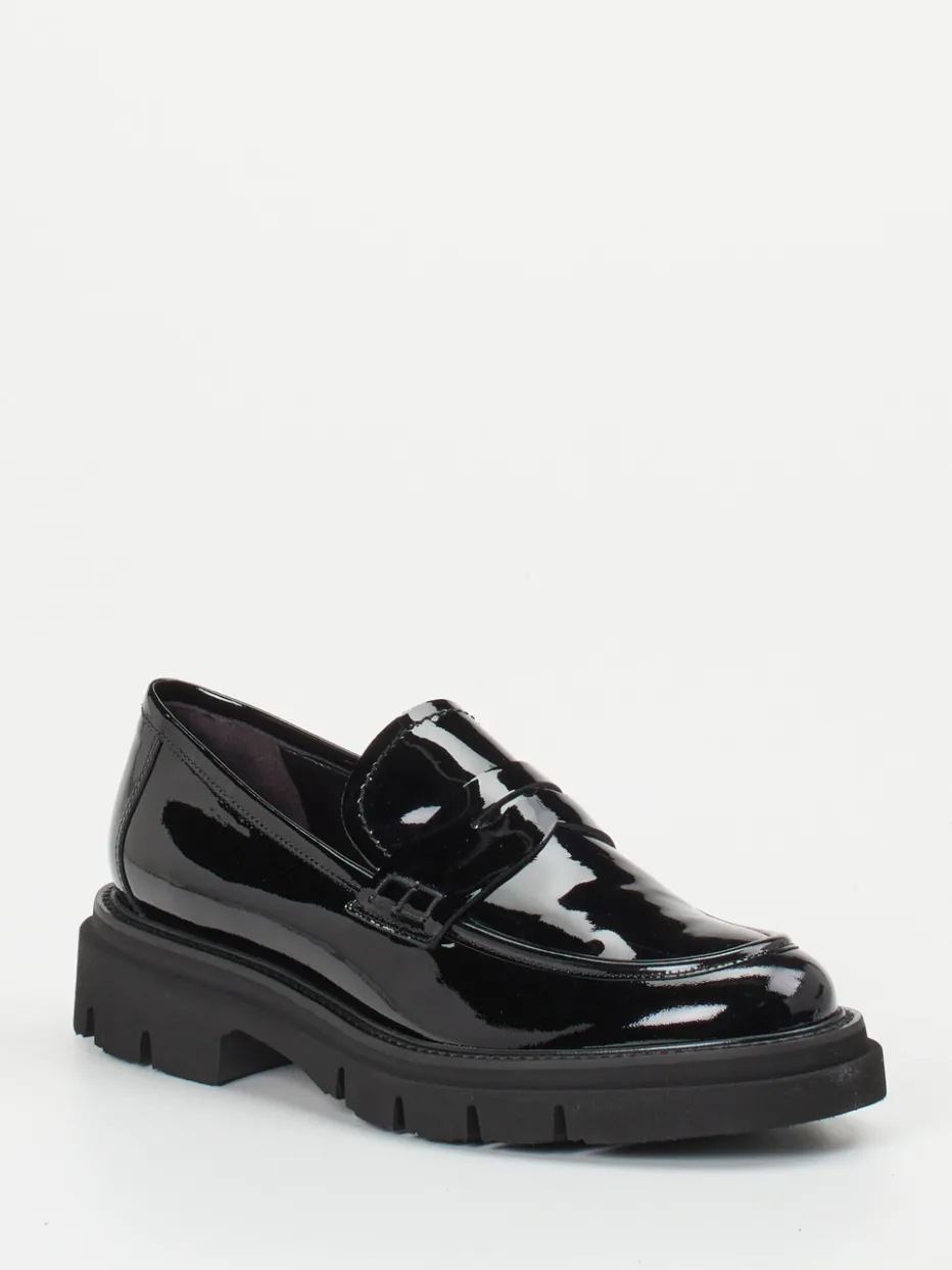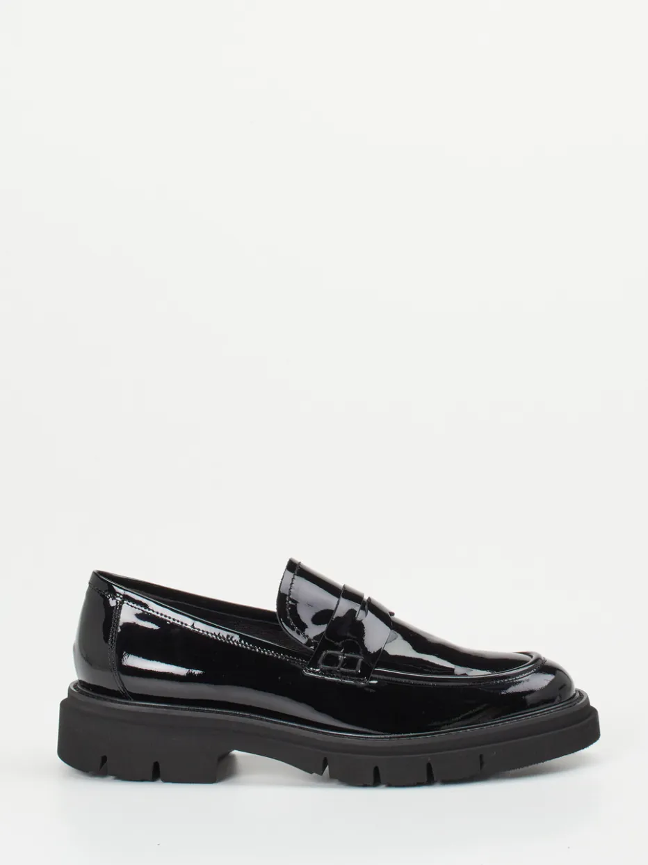 Glanz trifft auf Profil.Mannori präsentiert einen modischen Damen-Loafer mit vielseitigem Charakter. Der schwarze Chunky-Loafer aus hochglänzendem Lackleder verbindet klassischen Minimalismus mit urbaner Aussagekraft. Die voluminöse Profilsohle aus Leichtzell schafft Kontrast zur eleganten Silhouette und bietet gleichzeitig Stabilität. Eine dekorative Zierspange mit Pennyschlitz sowie Ton-in-Ton Nähte setzen dezente Akzente. Die gepolsterte Innensohle aus Lammnappa sorgt für Komfort – ideal für Bürolooks oder trendorientierte Streetstyle-Varianten mit Straight-Leg-Hose und Crossbody-Bag. Ein vielseitiges Modell mit Progression – für modebewusste Auftritte im Alltag und Business.