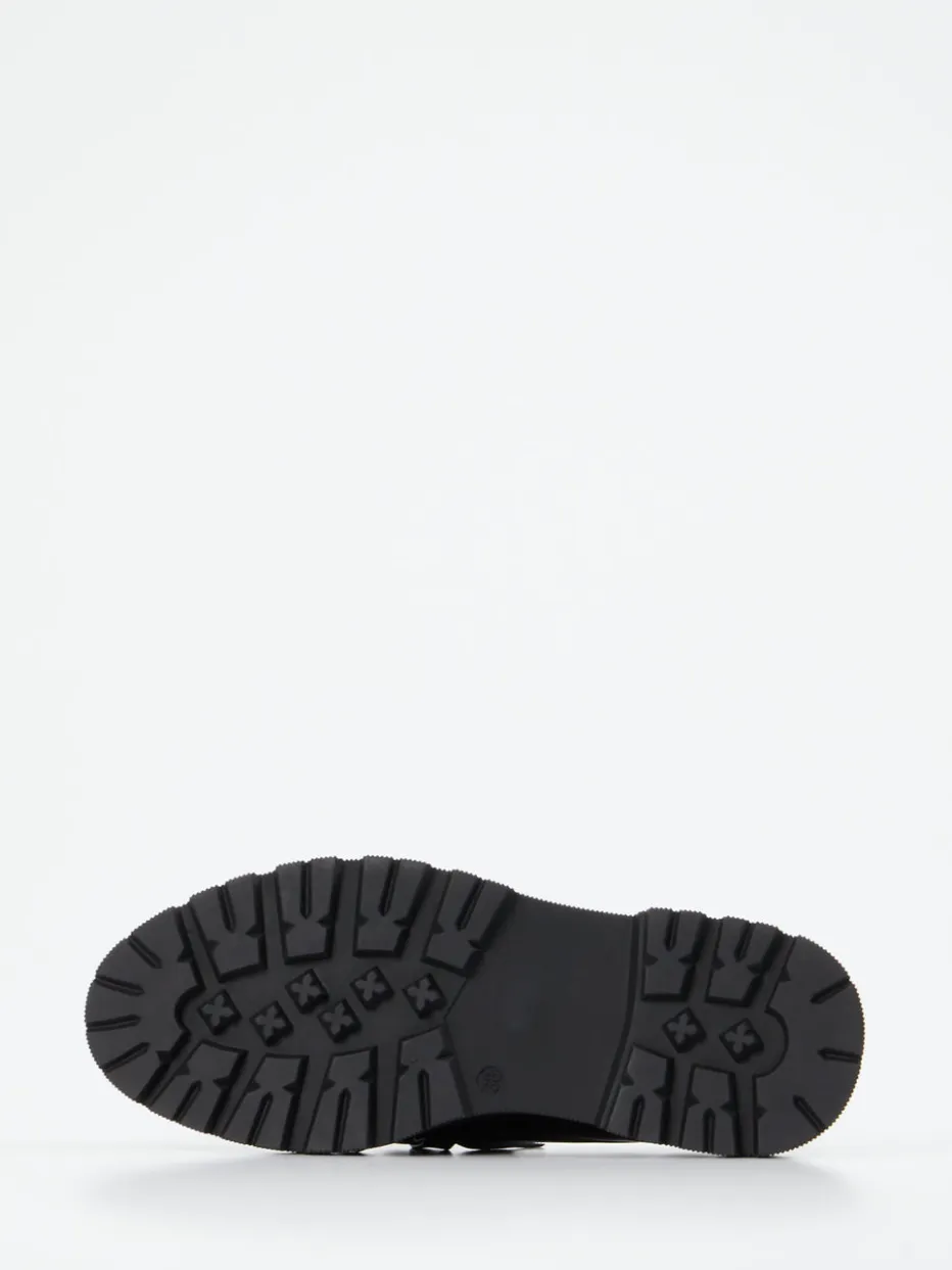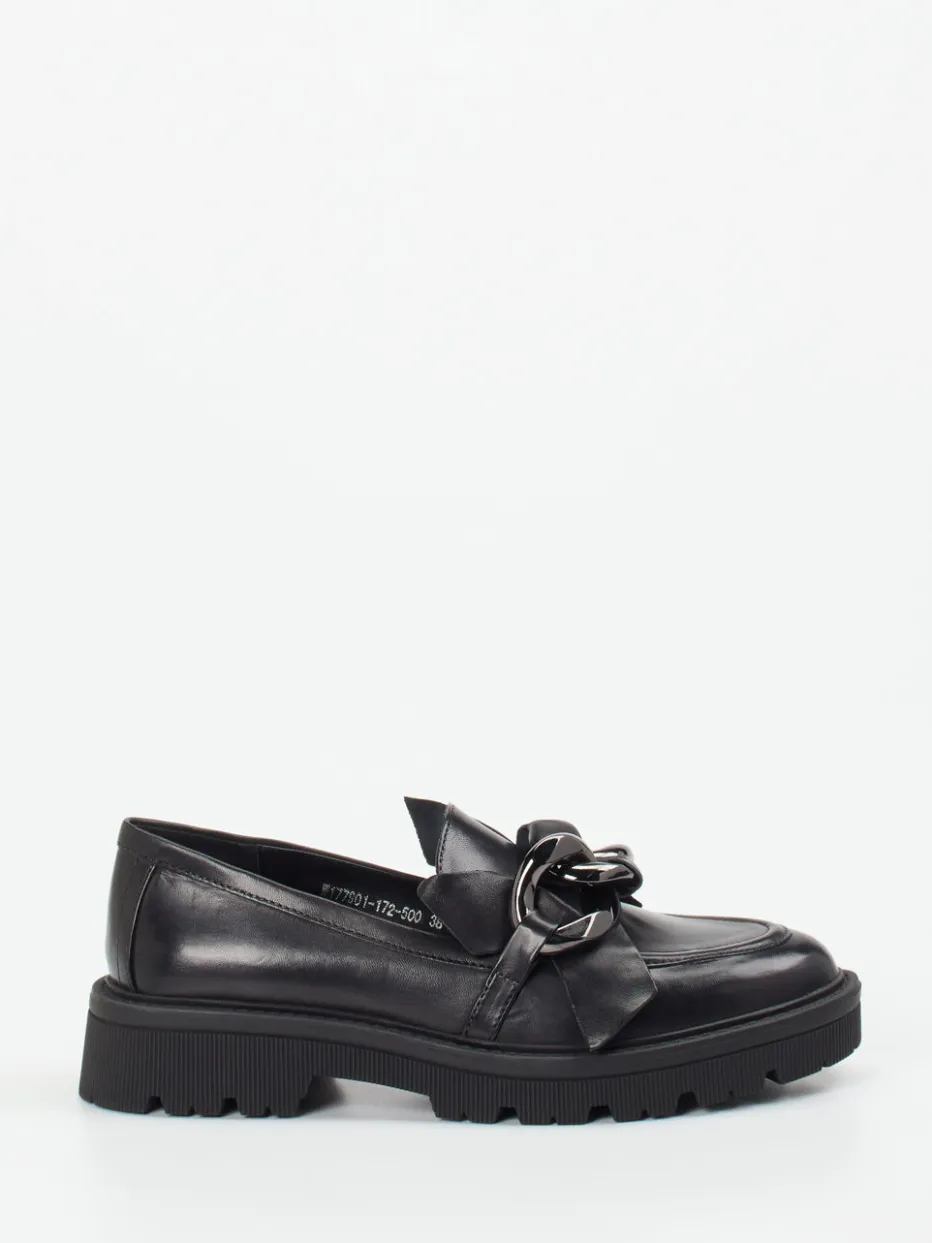 Der schwarze Loafer kombiniert edles, leicht glänzendes Lammleder mit auffälligem Kettendetail. Die breite Profilsohle unterstreicht den trendbewussten Auftritt.
