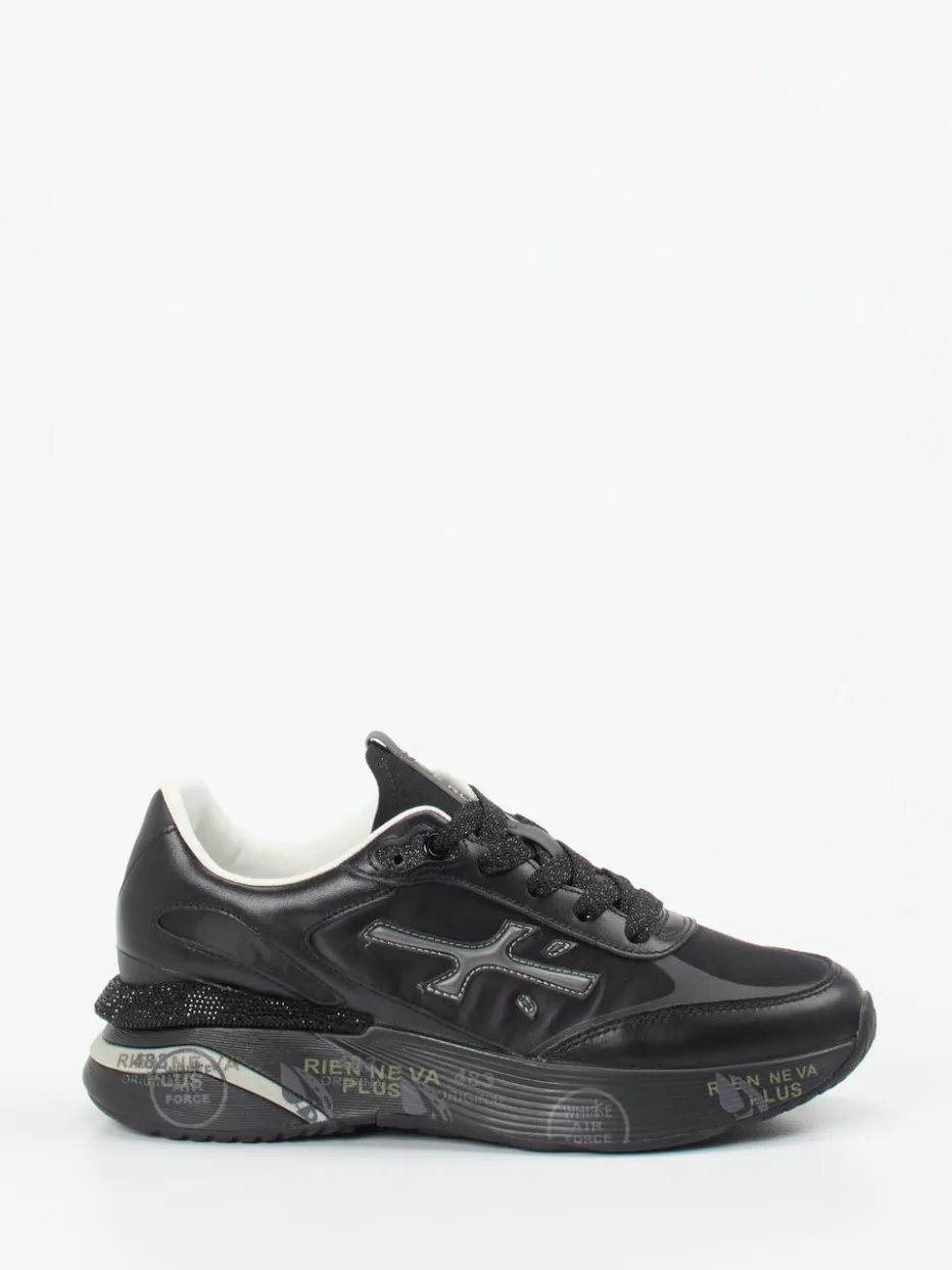 Unkonventioneller Look mit Volumen.Die italienische Marke Premiata präsentiert einen Damen-Sneaker mit markanter Chunky-Silhouette. Ideal für urbane Streetstyle-Outfits, kombiniert das Modell schwarzes Kalbleder mit matt strukturiertem Nylon, ergänzt durch glitzernde Schnürsenkel und irisierende Logo-Applikationen. Die voluminöse Gummisohle mit Print verleiht dem Design Dynamik und sicheren Halt. Mit getöntem Innenfutter aus Leder und herausnehmbarer Innensohle überzeugt der Schuh durch Komfort. Reflektierende Elemente setzen modische Akzente im Stil der Y2K-Ästhetik. Ein Statement-Piece mit Ausdruck für trendbewusste Looks der neuen Saison.