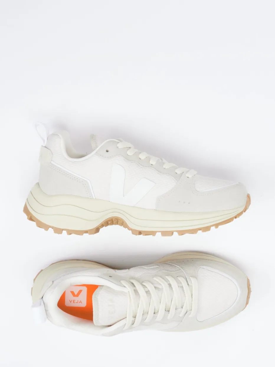 Funktionalität im minimalistischen Design.Veja präsentiert mit diesem Chunky Sneaker ein Modell für Freizeit und Alltag. Wenn urbaner Stil auf umweltbewusste Funktion trifft, entsteht ein Sneaker wie dieser: Das atmungsaktive Obermaterial aus cremeweißem Textil besteht zu über 50 % aus Bio-Baumwolle und wird ergänzt durch hellgraues Veloursleder mit matter Oberfläche. Die voluminöse Silhouette setzt auf Ton-in-Ton-Nähte und eine rückseitige Zuglasche; seitlich zeigt sich ein dezentes Logo. Eine stoßdämpfende Naturkautschuksohle mit auffälligem Outdoor-Profil sorgt für Grip bei jedem Schritt. Inspiriert von Quiet-Luxury-Ästhetik und dem Gorpcore-Trend passt das Modell ideal zu Oversize-Shirts oder Funktionsjacken. Nachhaltige Qualität und zeitgemäßer Look – klar erkennbar im Design von Veja.
