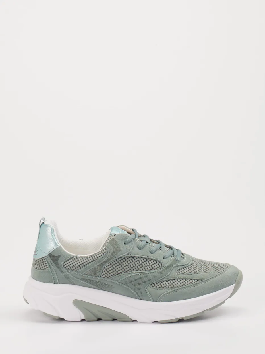 Trend-Pastell trifft Komfort-Sohle. Gabor Comfort präsentiert einen modisch-voluminösen Damen-Sneaker mit bequemer Passform. Ob für aktive Alltagseinsätze oder entspannte Freizeitmomente – dieser Chunky Sneaker überzeugt mit einem Mix aus Velour und Textilmaterial. Das atmungsaktive Mesh sorgt für ein angenehmes Fußklima, während die salbeigrüne Farbgebung mit Offwhite- und Hellmint-Akzenten modern wirkt. Die voluminöse Silhouette greift den Trend der Chunky Soles auf, unterstützt durch ein metallisches Fersenelement und tonale Nähte. Durch die Schnürung lässt sich der Sneaker individuell anpassen. In Kombination mit sportlich-legeren Outfits entfaltet er sein volles Style-Potenzial. Rollingsoft-Technologie für besonders komfortables Gehen im Alltag.