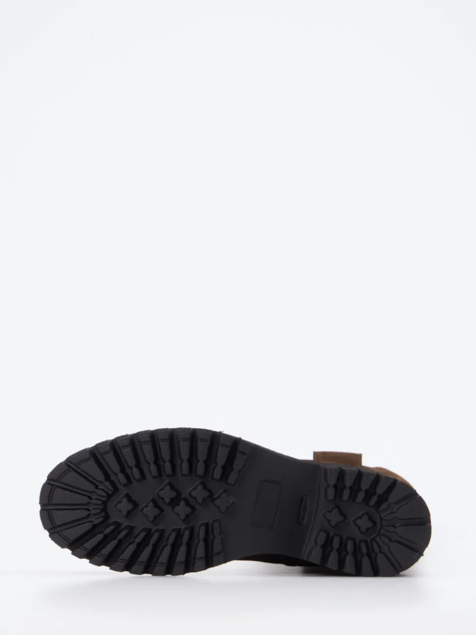 Wärmen mit Stil – perfekt für Herbsttage.Konstantin Starke präsentiert hier einen Damen-Stiefel mit moderner Chunky-Silhouette und hochwertiger Verarbeitung. Für kühle Alltagsmomente oder entspannte Outdoor-Ausflüge bietet das Modell aus braunem Veloursleder mit samtiger Haptik angenehme Wärme dank hell gefüttertem Lammfell. Gerade in Kombination mit der robusten, stark profilierten Leichtzell-Sohle und der praktischen Zuglasche entsteht ein funktional-eleganter Look. Die gedeckte Farbe und das reduzierte Design unterstreichen den Utility-Charakter und greifen den Trend „Quiet Luxury“ auf. Ideal kombinierbar mit Steppmantel und Cordhose. Schlicht-eleganter Komfortschuh für anspruchsvolle Casual-Garderoben.
