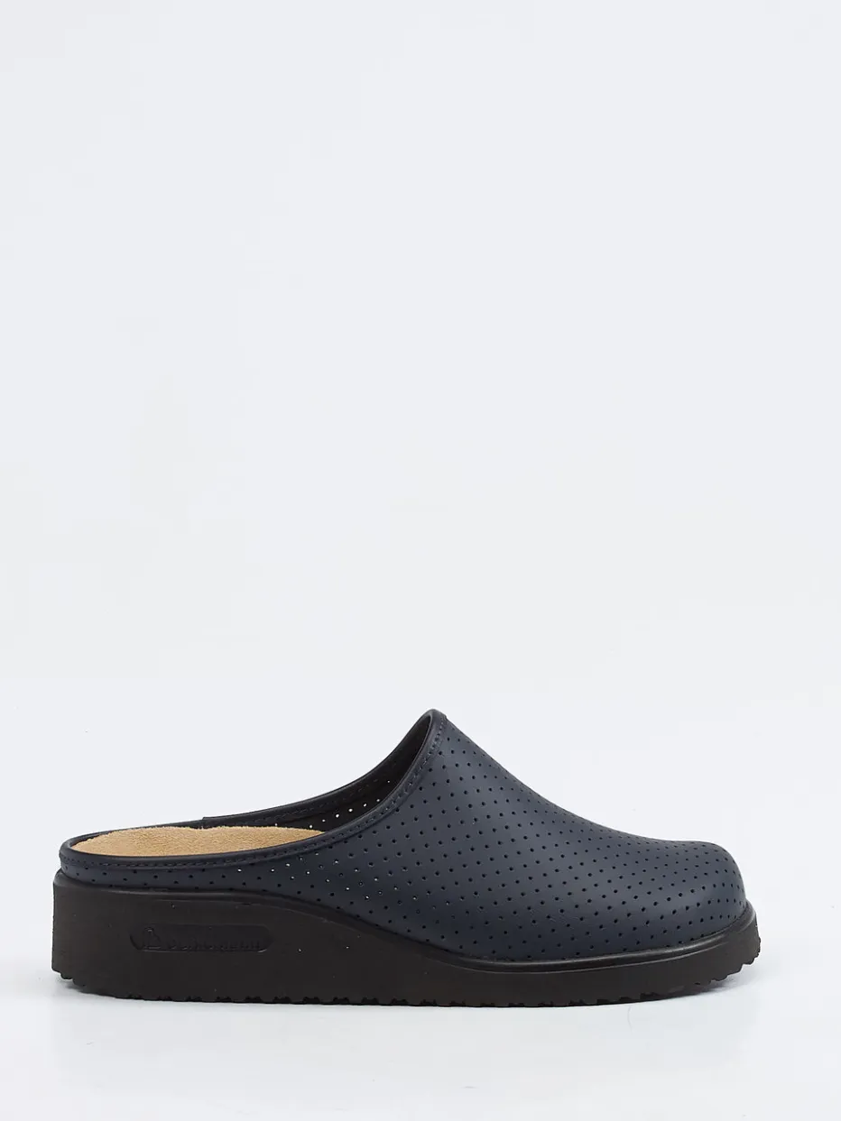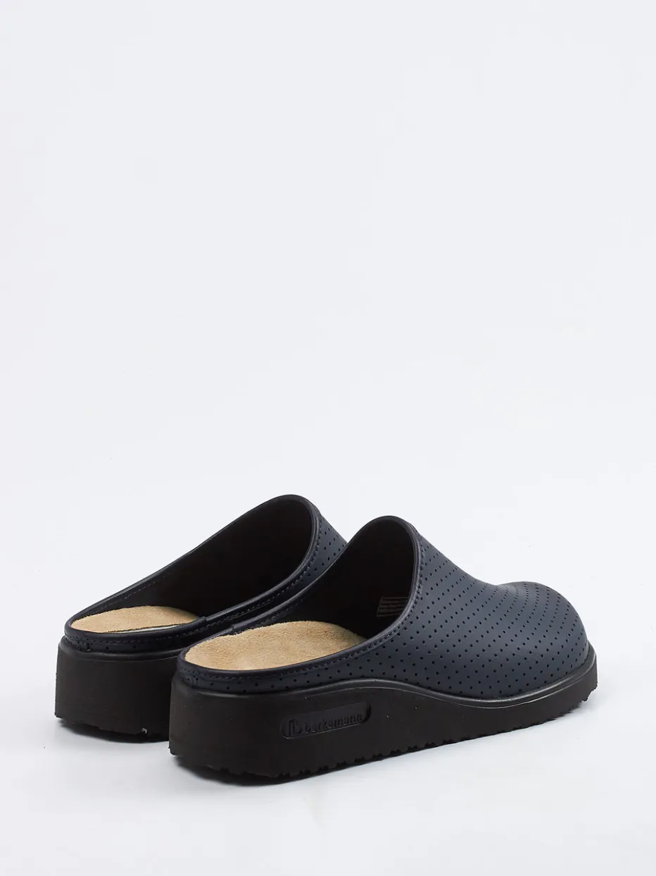 Balance aus Komfort und Ästhetik.Berkemann präsentiert einen Clog für entspannte Momente im Alltag. Der dunkelblaue Hausschuh richtet sich an Komfortliebende und verbindet hochwertiges Kalbleder mit einer matt wirkenden, perforierten Oberfläche für atmungsaktiven Tragekomfort. Die geschlossene, im Fersenbereich offene Form unterstützt schnelles Hineinschlüpfen, während das lederbezogene, ergonomisch geformte Wechselfußbett individuelle Anpassungen erlaubt. Mit seiner schwarzen PU-Profilsohle und dem leichten Keilabsatz bietet das Modell zuverlässigen Halt und punktet im „Functional Footwear“-Trend. Ideal zu Wollsocken oder Loungewear kombinierbar. Zeitgemäßer Komfort trifft auf funktionale Handwerkskunst von Berkemann.