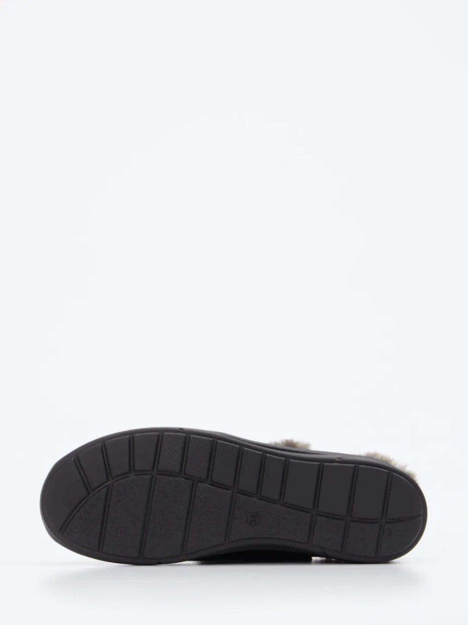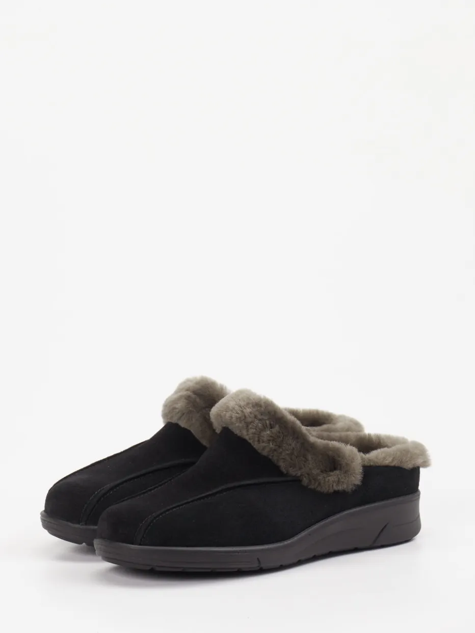 Wärmender Komfort für kalte Tage. Sabalin präsentiert einen stilvollen Hausschuh in Clogform für Damen. Ideal für gemütliche Stunden daheim: Das Modell überzeugt durch geschlossene Vorderkappe und offene Ferse in praktischer Schlupfform. Das schwarze Obermaterial aus Leder zeigt sich in matter Veloursoptik und wird innen von einem warmen Futter mit sichtbarem Kunstfellrand in natürlichem Nussbraun ergänzt. Tonale Ziernähte und eine profilierte PU-Sohle unterstreichen den funktionalen Charakter. Der Look ist von Loungewear-Trends inspiriert – eine perfekte Ergänzung zur Homewear. Harmoniert ideal mit weichen Strickhosen oder Fleeceanzügen. Sabalin steht für durchdachten Komfort in formschönem Design – perfekt für entspannte Wintermomente.