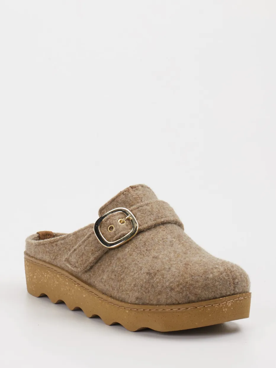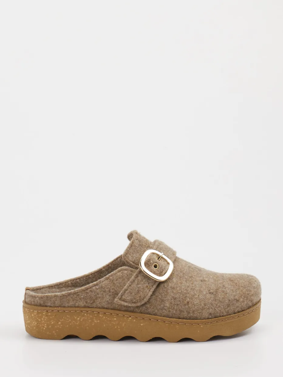 Ob beim Entspannen zu Hause oder als bequemer Alltagsbegleiter – das weiche Filzmaterial mit melierter Oberfläche sorgt für ein angenehmes Tragegefühl. Die beigebraune Farbgebung unterstreicht den minimalistischen Look, während die ergonomisch geformte Plateausohle mit Profil optimalen Halt bietet. Ein verstellbarer Riemen mit goldfarbener Schnalle ergänzt das Design stilvoll. Der geschlossene Vorderfuß und die offene Fersenpartie greifen klassische Clog-Merkmale auf.