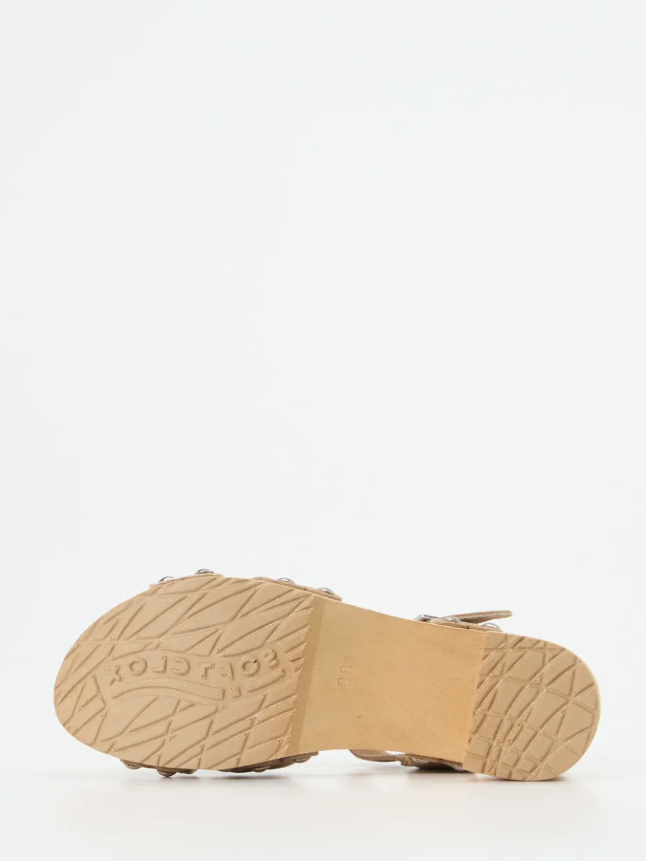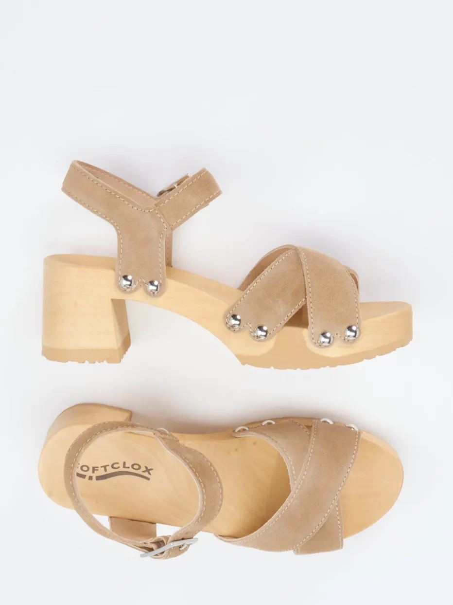 Retro-Charme trifft Naturmaterialien.Softclox zeigt mit dieser Damen-Clogsandale aus Veloursleder eine stilvolle Begleiterin für warme Tage. Ideal für Freizeit oder Urlaub besticht das Modell durch sein hellbraunes, weich genarbtes Veloursleder und große, silberfarbene Nieten – eine klare Anlehnung an skandinavisches Design mit 70s-Einschlag. Der Blockabsatz mit 6 cm, ergänzt durch eine Flex-Zone in der hölzernen Sohle, sorgt für angenehme Laufhöhe und Tragekomfort. Die überkreuzten Riemen und der individuell verstellbare Fersenriemen mit silberfarbener Dornschließe runden den Look ab. Kombiniert zu Leinenkleidern entsteht ein naturinspirierter Sommerlook. Das flexible Naturholz-Fußbett unterstreicht die Handwerklichkeit und passt ideal zur Craftcore-Ästhetik.