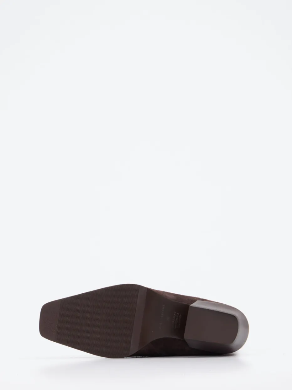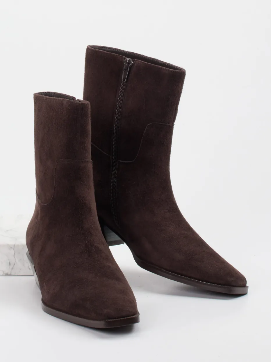 Ideal für urbane Freizeit-Looks oder abendliche Ausgeh-Momente: Der gerade Schaft und die spitz zulaufende Front aus samtig mattiertem Veloursleder in Dunkelbraun verleihen dem Modell zeitlose Raffinesse. Der markante 4-cm-Blockabsatz im Western-Stil unterstreicht den modischen Minimalismus und korrespondiert elegant mit dem Ton-in-Ton gehaltenen Reißverschluss. Als Teil des Trends „Modern Western FW24“ lässt sich die Stiefelette vielseitig mit Kaschmirmantel oder Lederbag kombinieren.
