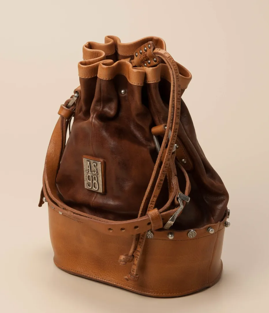 Die Beuteltasche von A.S. 98 vereint robustes Kalbleder mit einem angesagten Vintage-Look und silberfarbenen Details – ideal für urbane Styles.