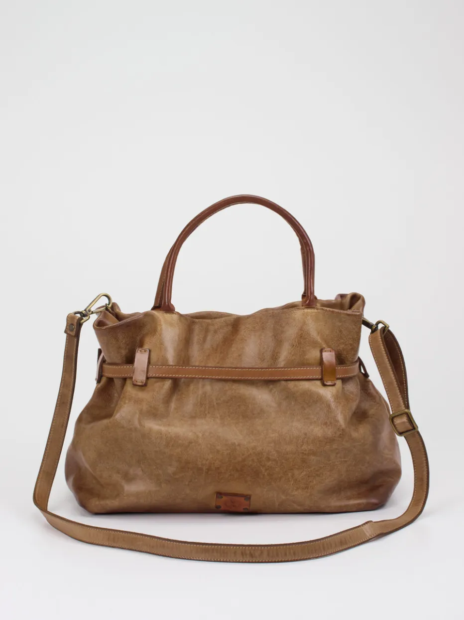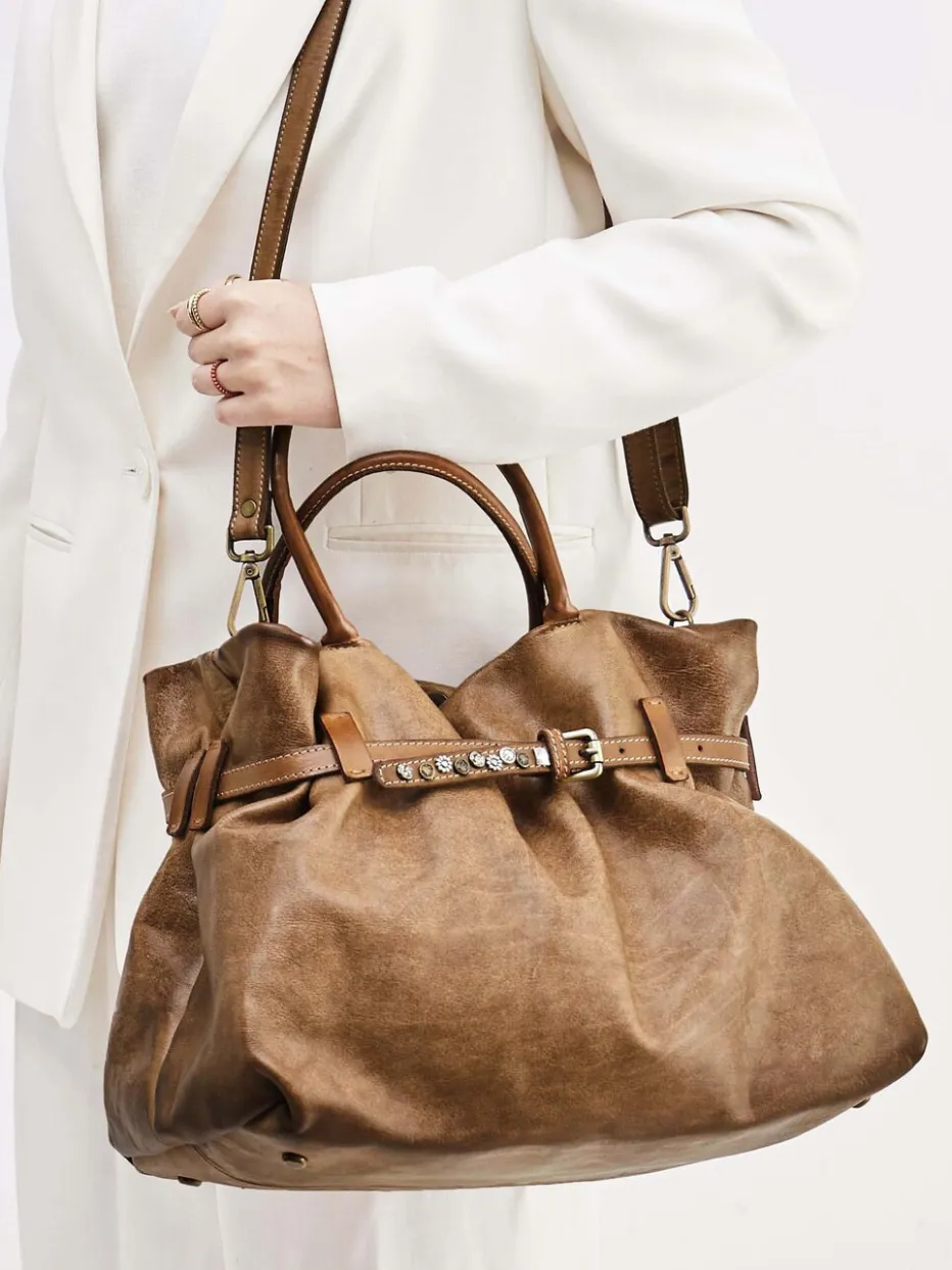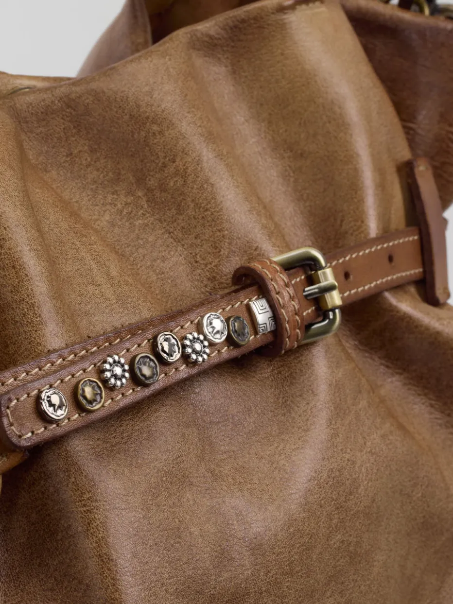 Diese geräumige Tasche aus cognacfarbenem Kalbleder besticht durch Vintage-Charme und raffinierte Details. Ziernieten und antikgoldene Hardware verleihen dem Modell ein stilvolles Update mit Boho-Flair.