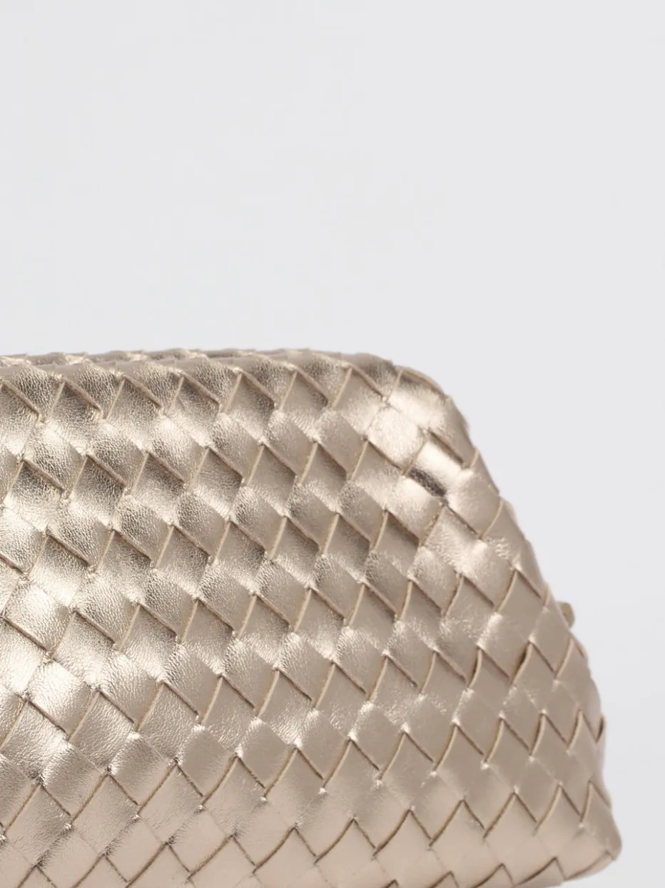 Die fein gearbeitete Trapezform und das champagnergoldene Metallic-Finish vereinen traditionelle Flechtkunst mit modernem Minimalismus. Ein elegantes Accessoire für stilvolle Auftritte.