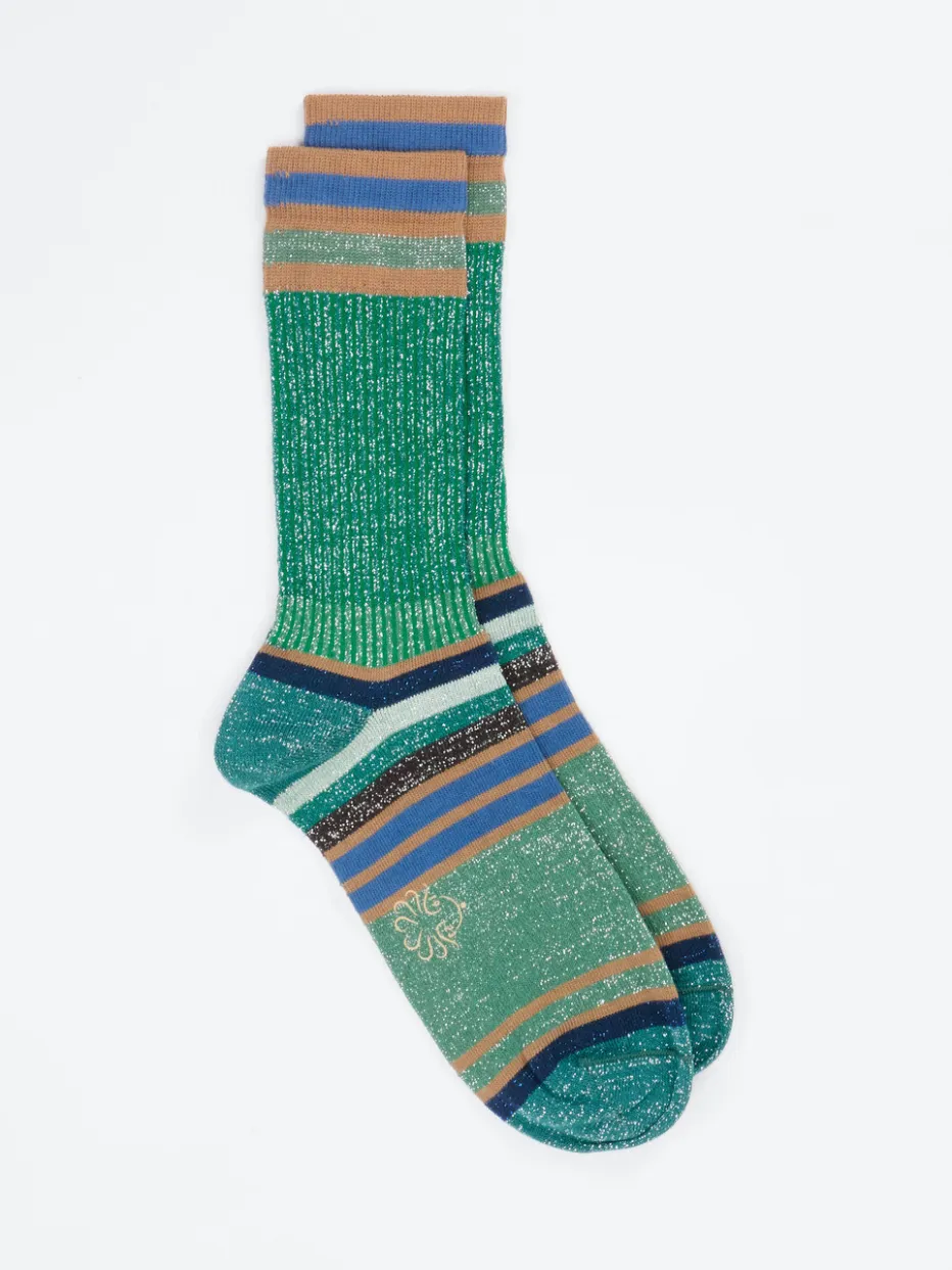 Diese Socken verbinden edlen Baumwollmix mit schimmerndem Lurex und sorgen dank Ringelstreifen in Smaragdgrün, Hellbraun und Stahlblau für einen auffälligen Retro-Look.