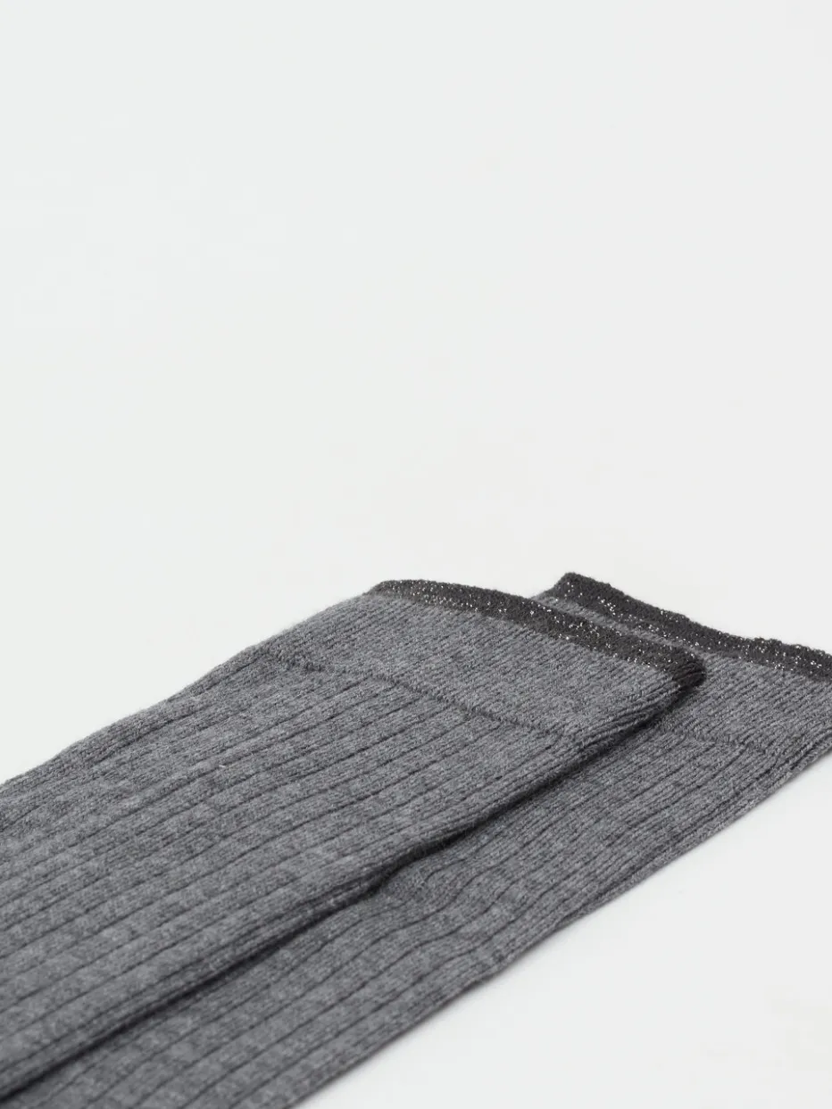 Sehr schick und kuschelig weich sind diese handgefertigten Kniestrümpfe aus dem Hause Alto Milano. Der Schurwollmix zeigt sich in einem klassischen Rippenstrick in Grau. Dezent platzierte, funkelnde Lurexfäden an Fußspitze, Ferse und Bündchen setzen einen tollen, modischen Akzent. – Material: 80% Schurwolle, 10% Baumwolle, 6% Polyamid, 2% Polyester, 2% Elastan – Pflegehinweis: Handwäsche bis max. 40°C