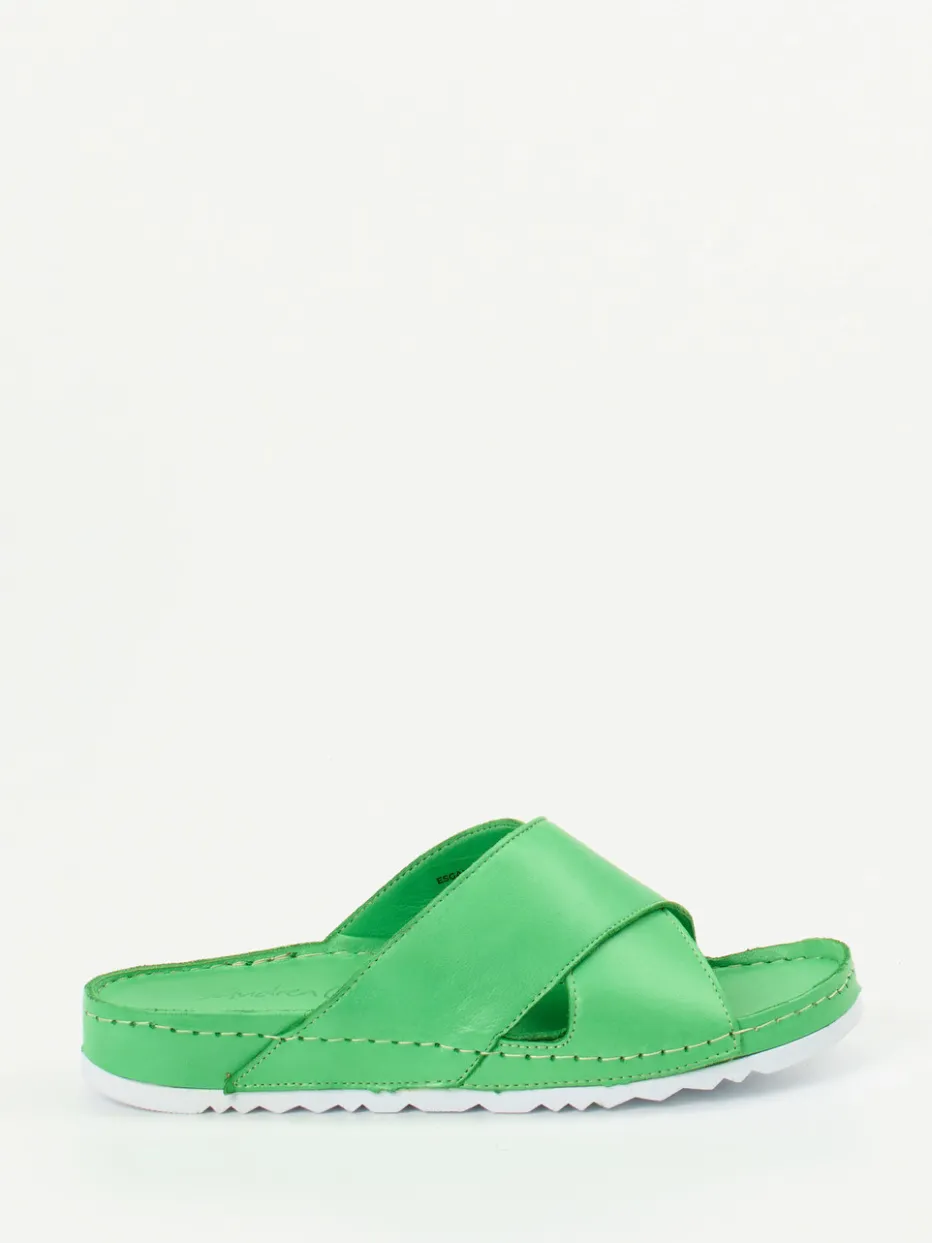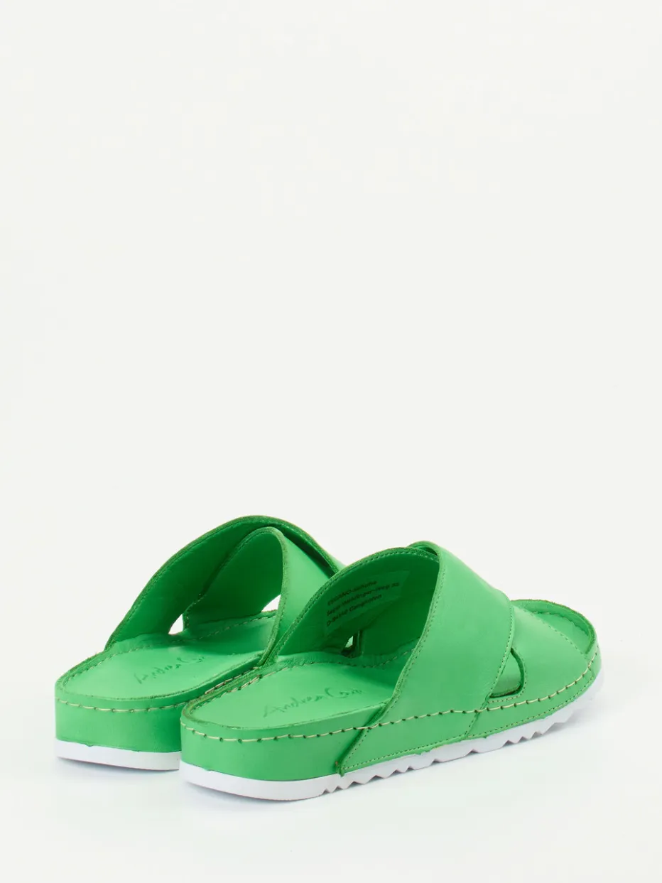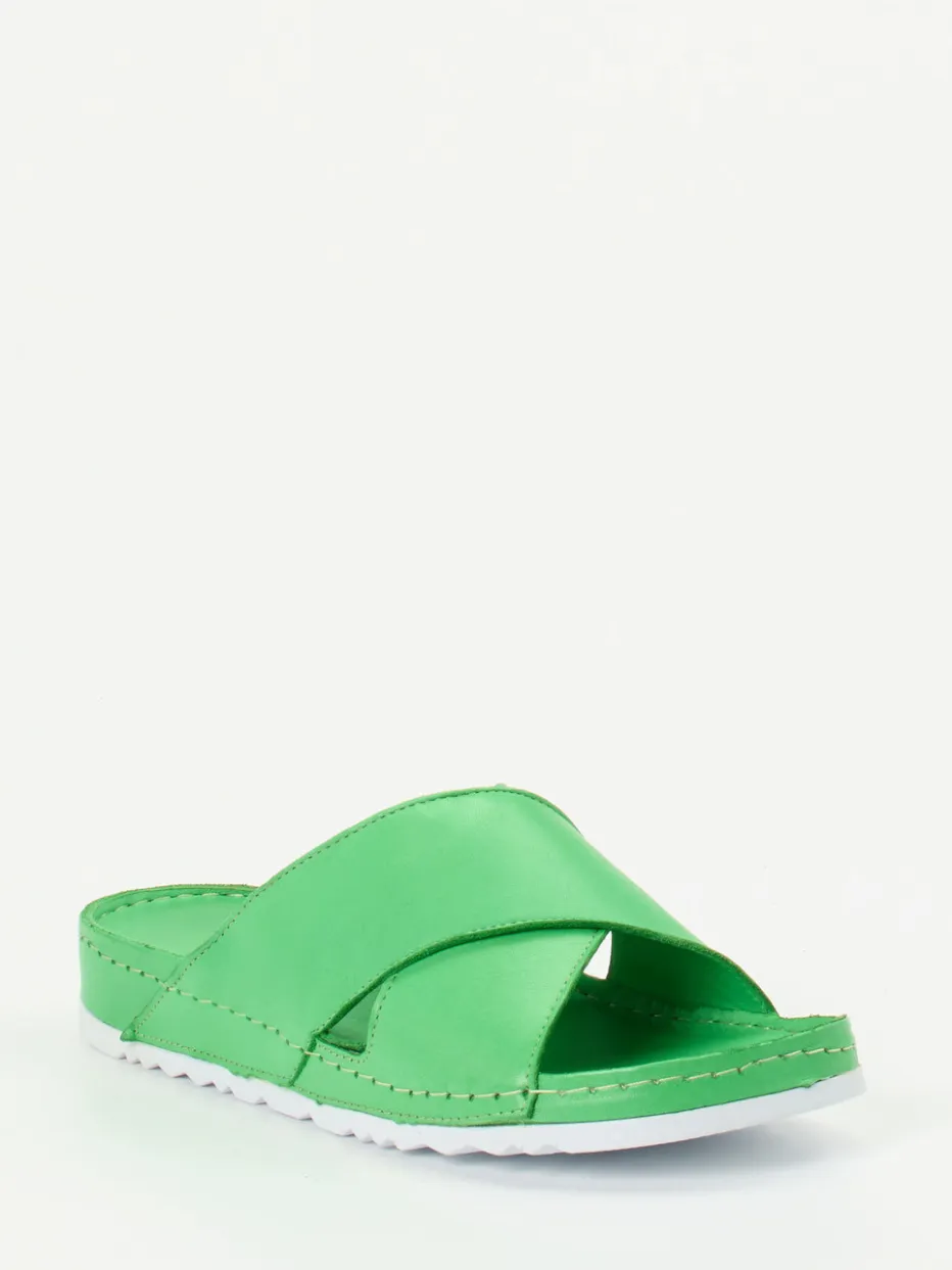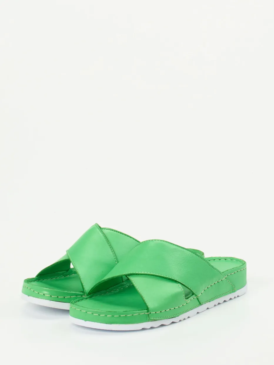 Frischer Auftritt für sonnige Tage.Andrea Conti zeigt bei diesen Damen-Pantoletten, wie stilvoll bequeme Schuhe sein können. Ideal für entspannte Tage im Freien verbinden die Pantoletten aus mattem Kalbleder in leuchtendem Grün handwerkliche Qualität mit modernem Design. Die zwei gekreuzten Riemen unterstreichen die offene, luftige Silhouette, während die weiße, profilierte Gummisohle für Trittsicherheit sorgt. Das ergonomisch geformte Lederfußbett erhöht den Tragekomfort spürbar. Der Look entspricht aktuellen Comfort-Slide-Trends mit einem Hauch Bold-Color-Statement. Andrea Conti steht hier für alltagstaugliche Leichtigkeit mit modischem Mehrwert.