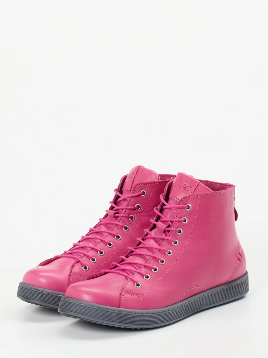 Farbstarke Leichtigkeit im Alltag.Andrea Conti präsentiert mit diesen Schnürboots eine lässige Damen-Stiefelette für stilbewusste Freizeitlooks. Die Kombination aus hochwertigem Kalbleder und matter Oberfläche kommt in intensivem Pink besonders modern zur Geltung. Die schlanke Silhouette und der seitliche Reißverschluss verbinden Komfort mit zeitgemäßem Design. Silberfarbene Ösen und tonige Nähte setzen dezente Akzente, während die flexible graue Gummisohle mit Fischgrätprofil für sicheren Halt sorgt. Inspiriert von Streetwear und aktuellen Farbtrends wie Color-Blocking ergänzt dieses Modell entspannte Outfits mit modischer Präzision. Andrea Conti überzeugt hier mit trendstarker Alltagstauglichkeit und bequemem Designanspruch.